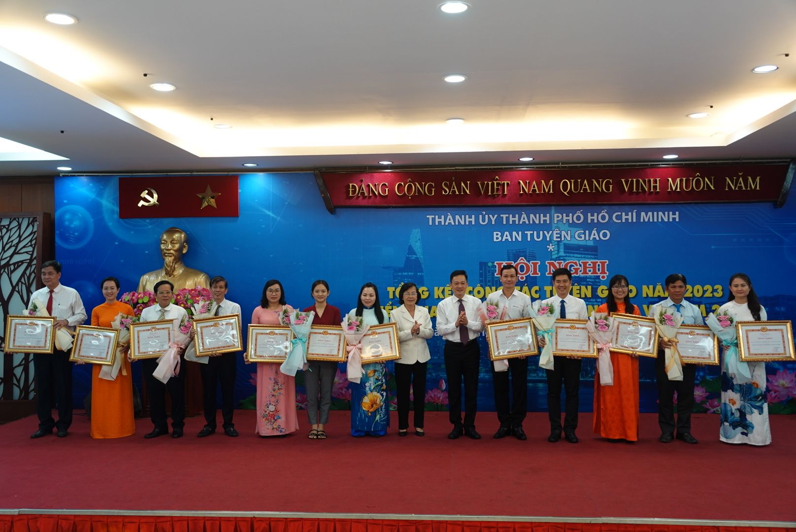 Khen thưởng các tập thể, cá nhân có thành tích trong công tác tuyên giáo năm 2023. Ảnh: Mạnh Hảo