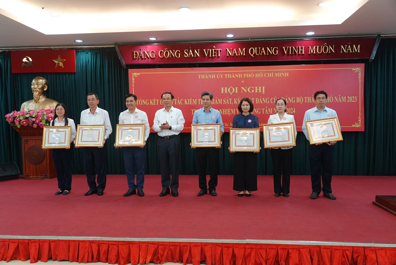 Khen thưởng các đơn vị có thành tích xuất sắc trong công tác kiểm tra, giám sát năm 2023. Ảnh: Mạnh Hảo