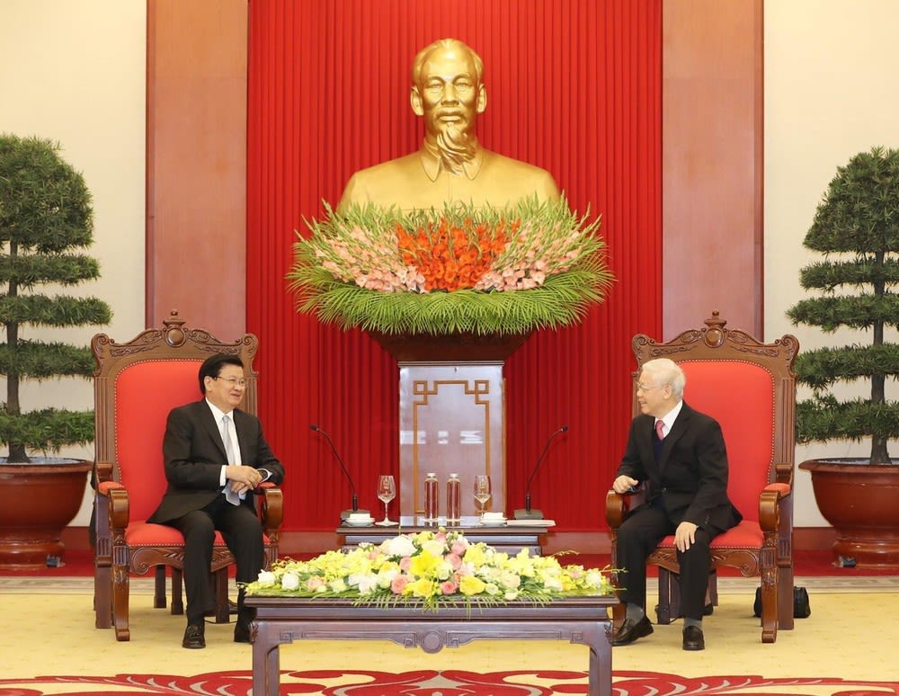 Tổng Bí thư, Chủ tịch nước Nguyễn Phú Trọng tiếp Thủ tướng Lào Thongloun Sisoulith nhân dịp dự Kỳ họp lần thứ 43 Ủy ban Liên Chính phủ Việt Nam-Lào về hợp tác song phương, ngày 6/12/2020. Ảnh: TTXVN