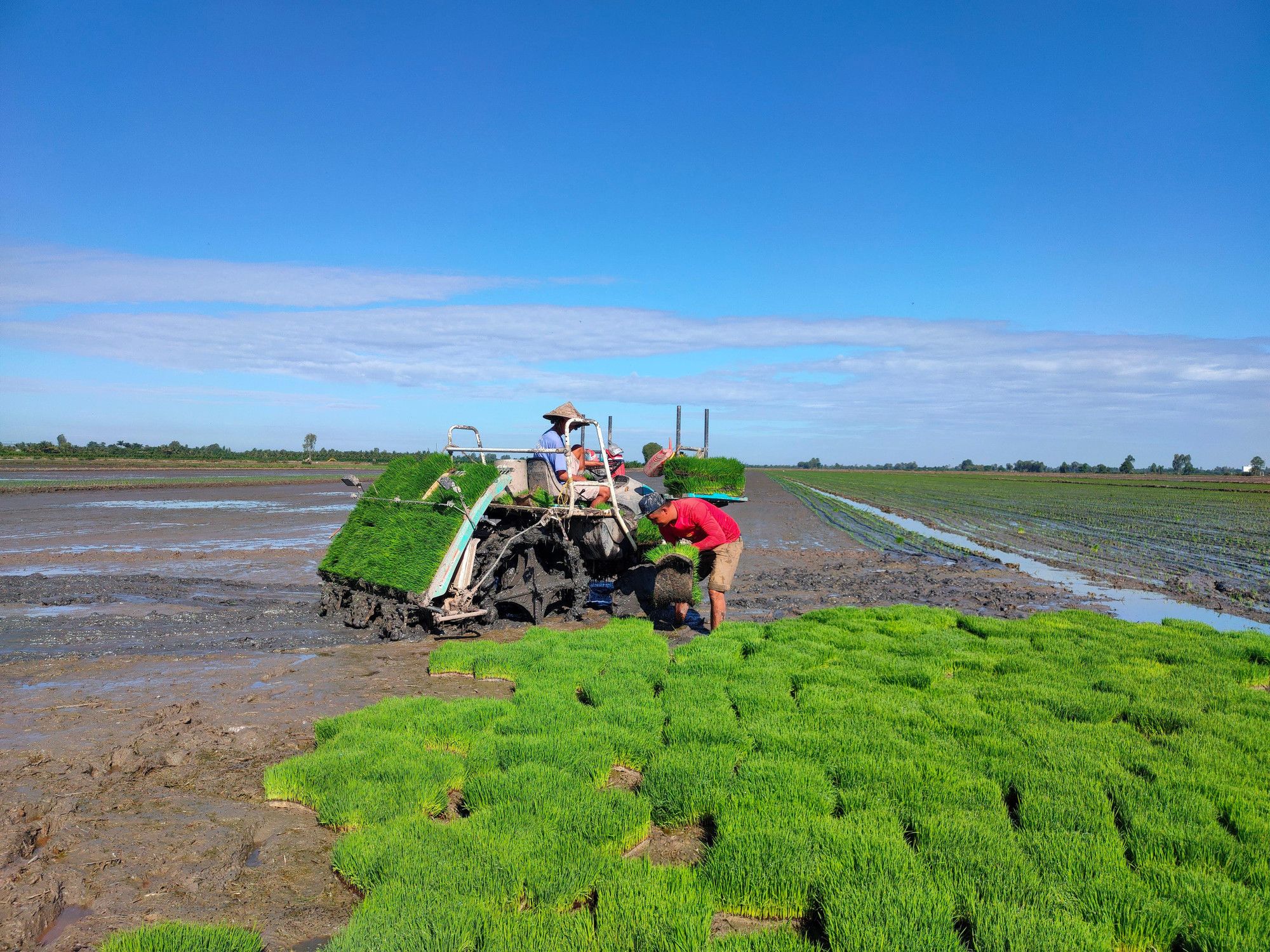 Máy cấy lúa hoạt động tại Hợp tác xã Mỹ Đông 2, xã Mỹ Đông, huyện Tháp Mười, tỉnh Đồng Tháp.
