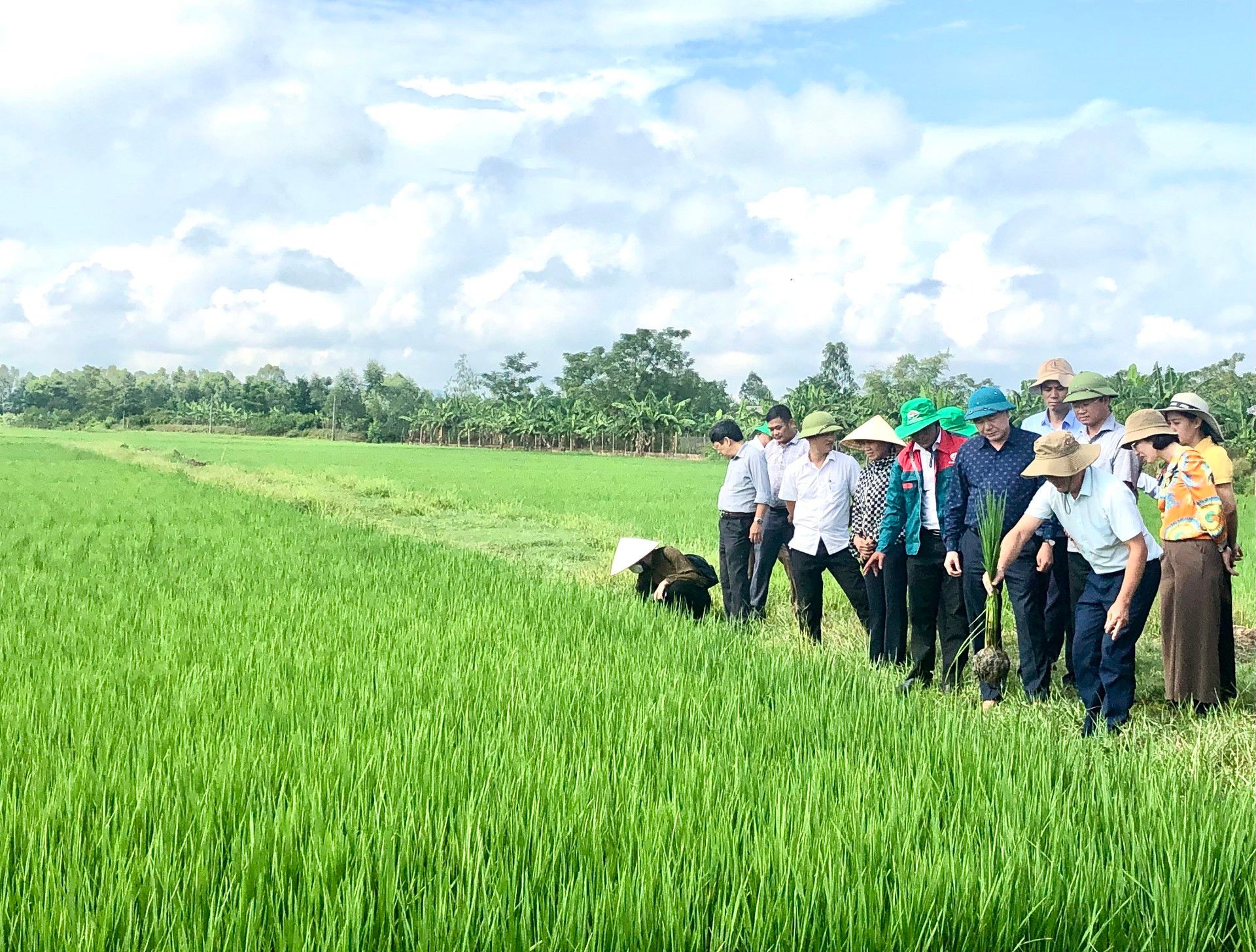 Nông dân kiểm tra lúa ở mô hình thí điểm 1 triệu ha lúa chất lượng cao ở tỉnh Trà Vinh.