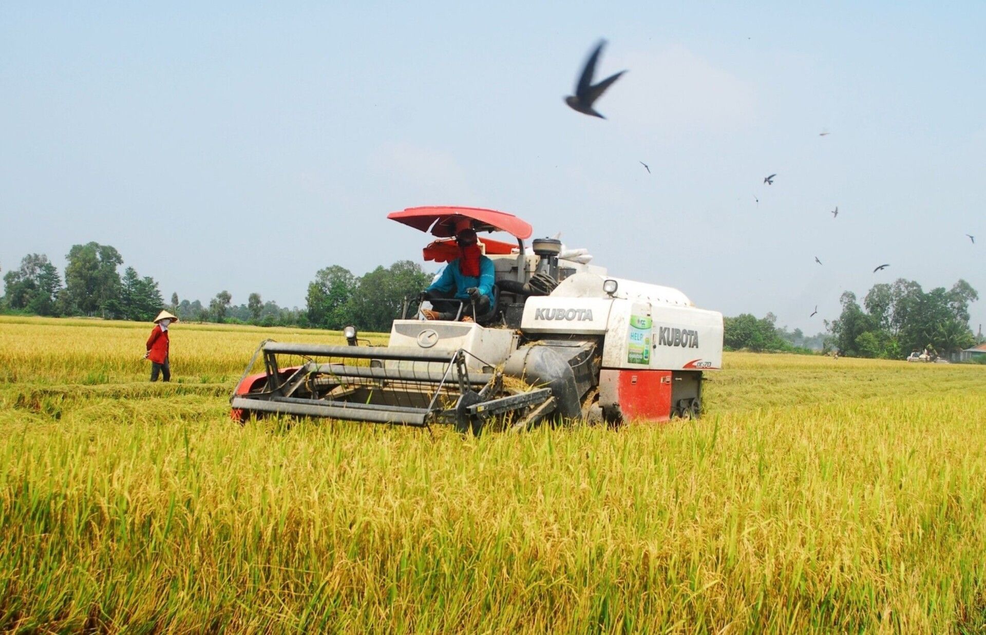 Người dân xã Hậu Mỹ Trinh, huyện Cái Bè (Tiền Giang) thu hoạch lúa hè thu 2023.