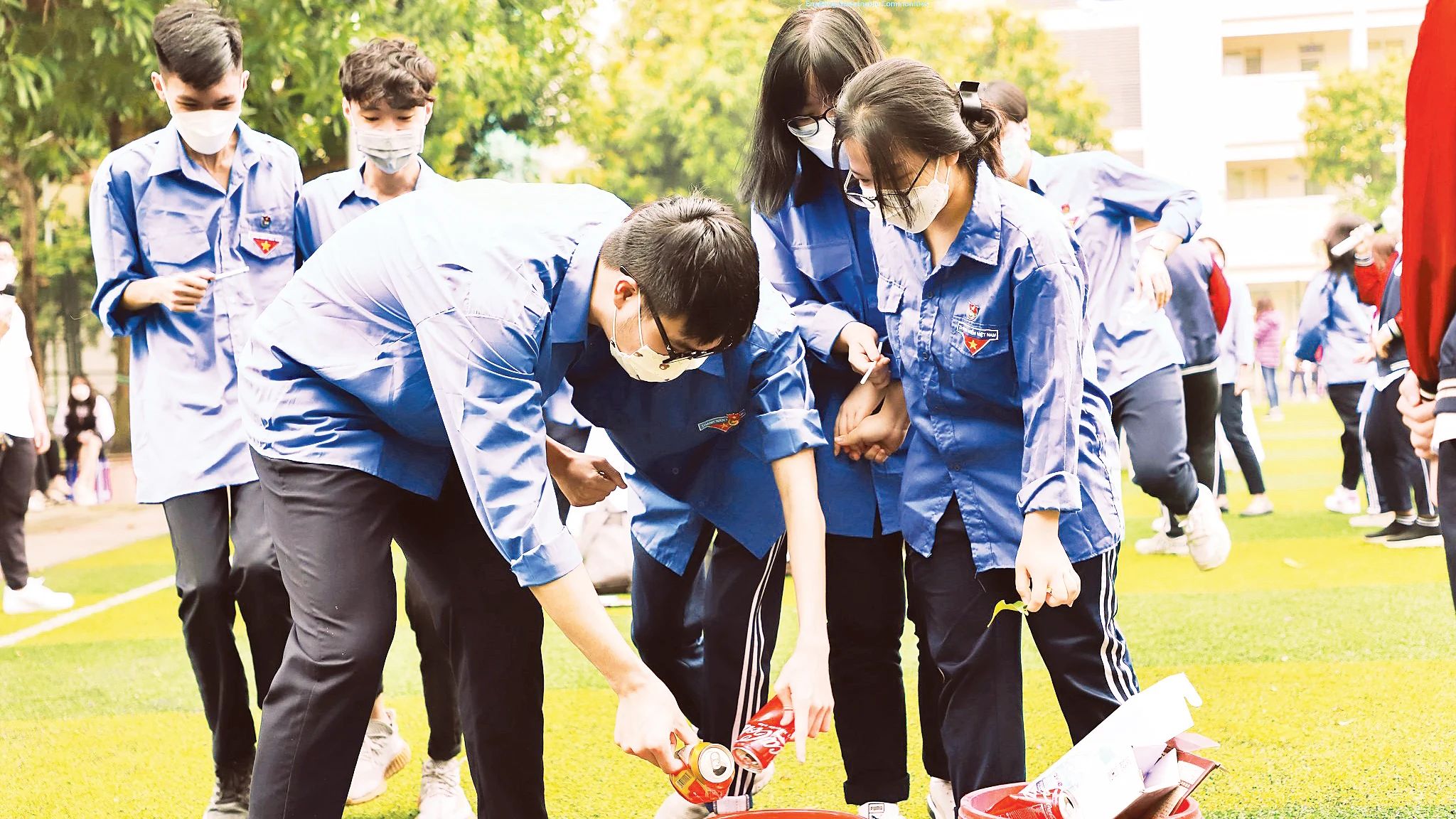 Học sinh Trường TH, THCS và THPT Thực Nghiệm Khoa học Giáo dục tham gia hoạt động phân loại rác thông qua trò chơi trải nghiệm. (Ảnh do Trung tâm Hỗ trợ Phát triển Xanh GreenHub cung cấp)
