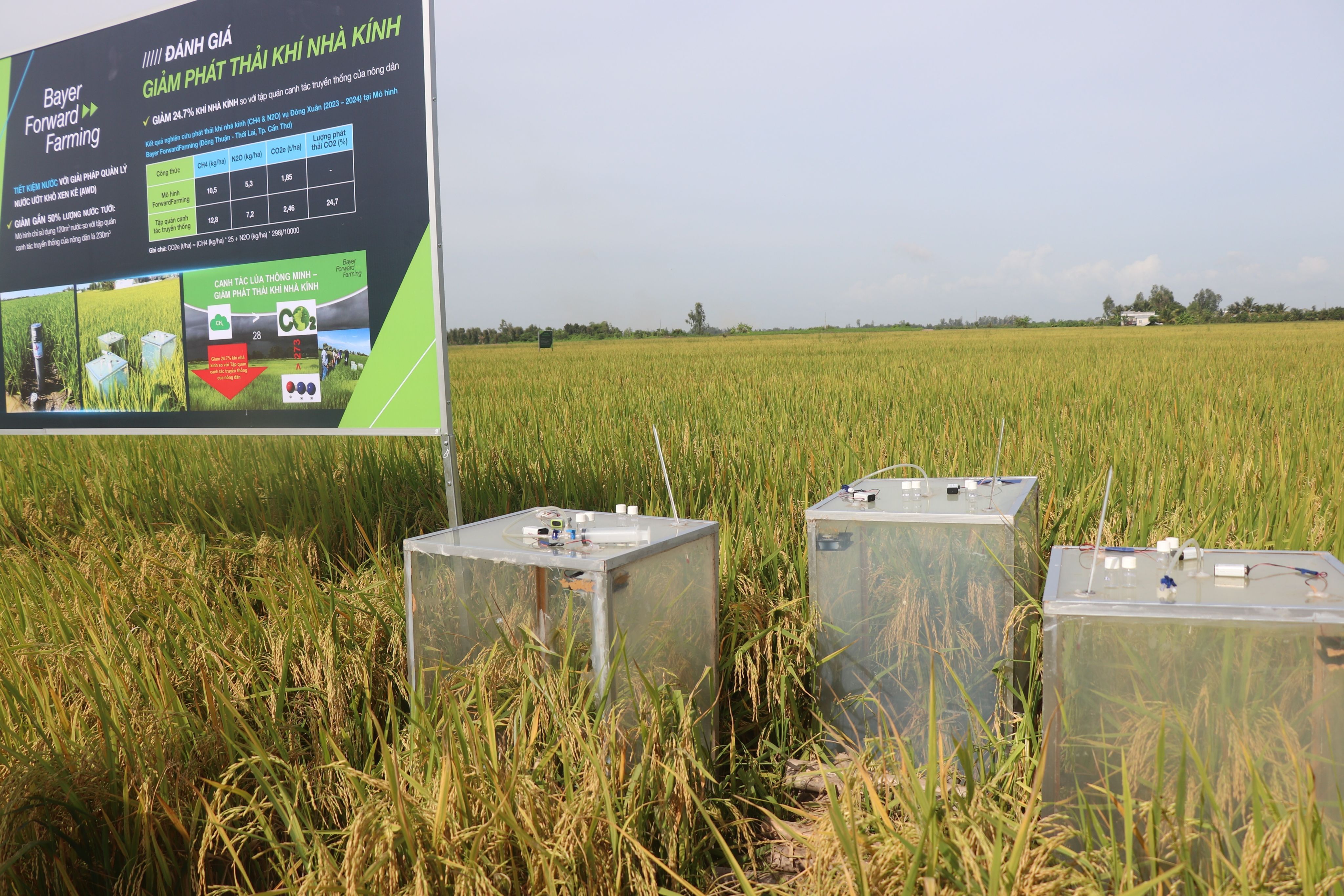 Thiết bị đo khí phát thải được thí điểm trên đồng ruộng ở thành phố Cần Thơ. (Ảnh: THU HIỀN/TTXVN)