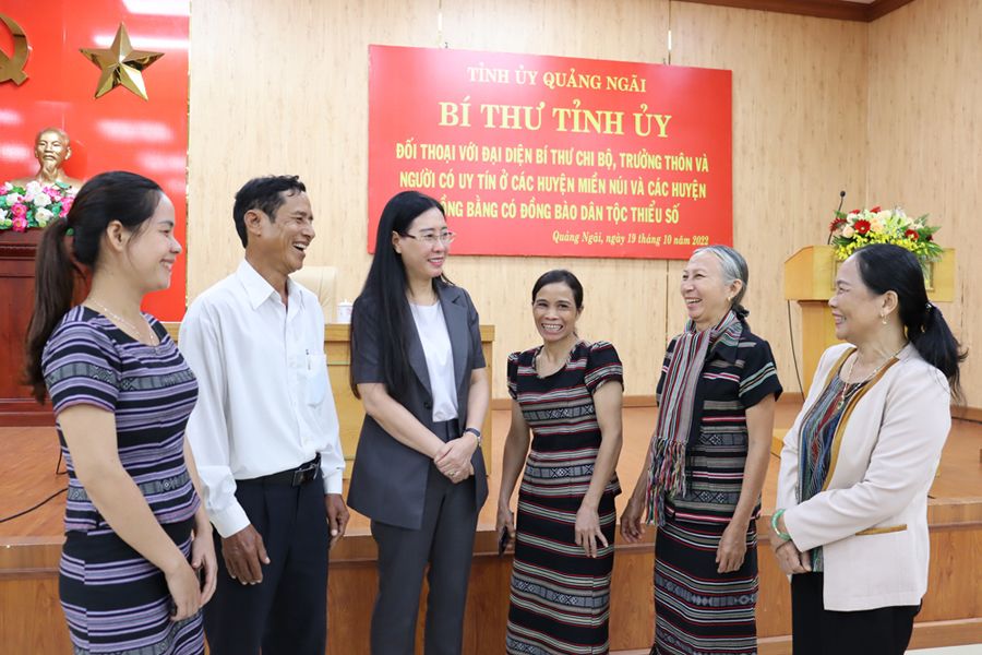 Đồng chí Bùi Thị Quỳnh Vân, Bí thư Tỉnh ủy Quảng Ngãi trò chuyện cùng đồng bào dân tộc thiểu số.