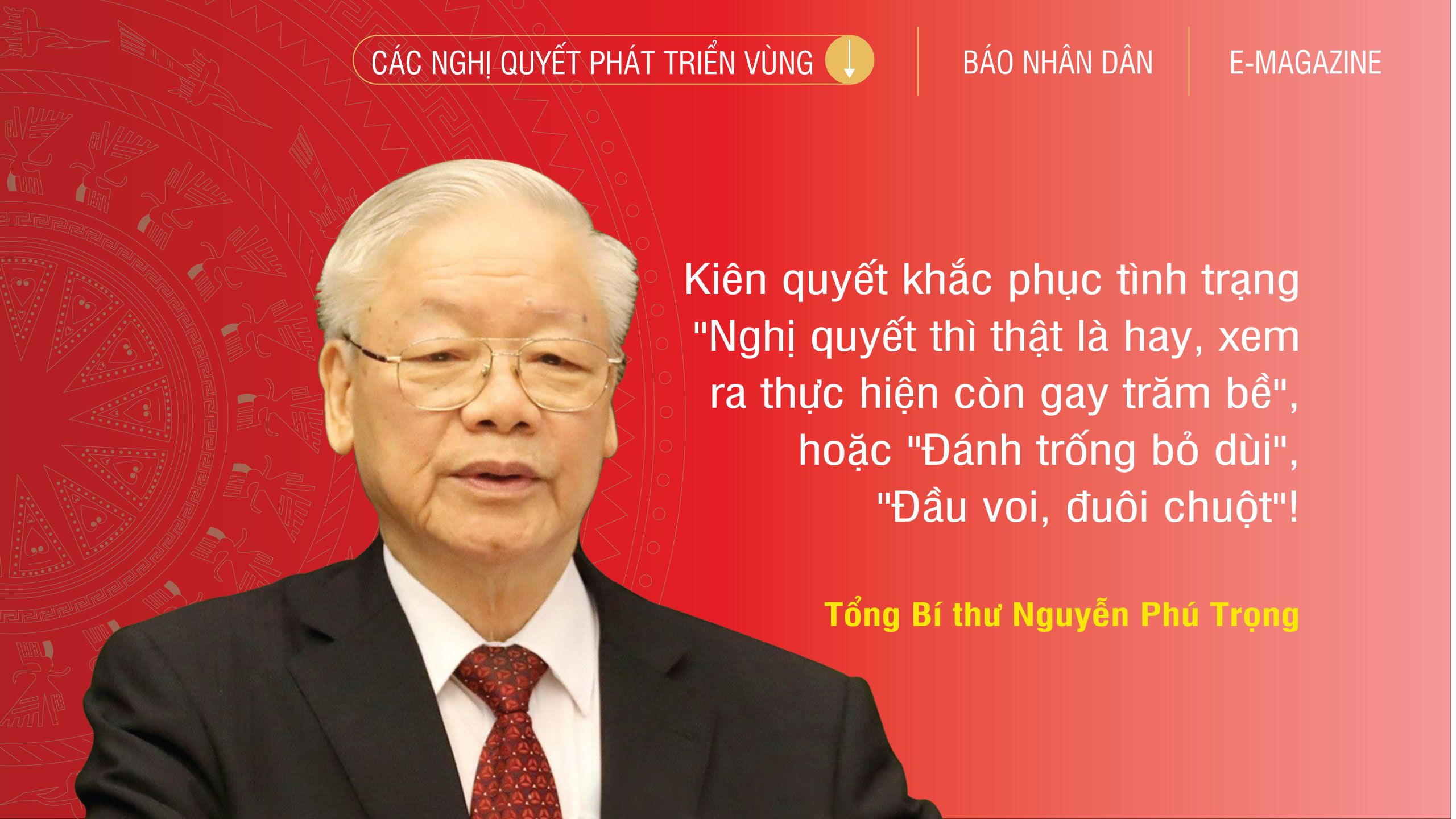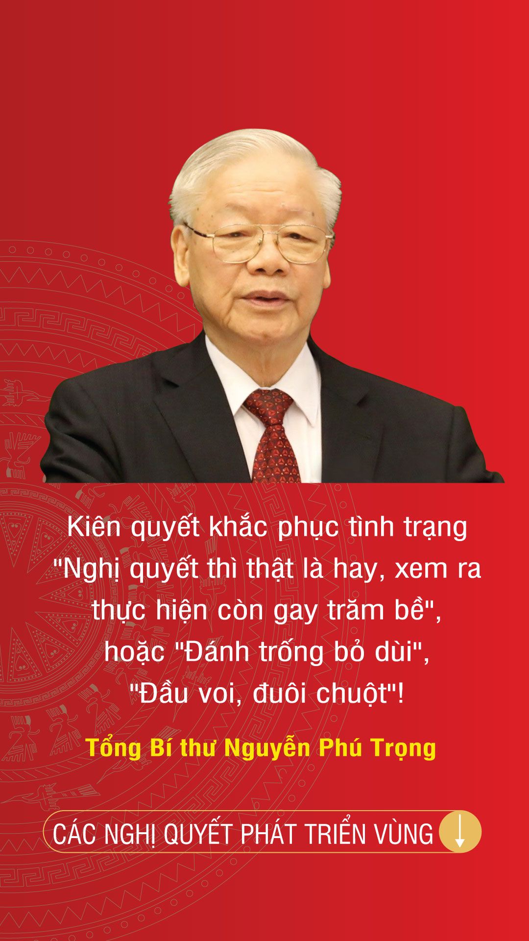 Để tổ chức thực hiện thật tốt, có kết quả thiết thực các Nghị quyết lần này của Bộ Chính trị, Tổng Bí thư Nguyễn Phú Trọng đề nghị, phải nhận thức thật đầy đủ và sâu sắc mục đích, ý nghĩa, yêu cầu, nội dung của Nghị quyết, nắm vững những quan điểm, tư tưởng chỉ đạo, những công việc phải làm, trên cơ sở đó có sự thống nhất cao về ý chí, quyết tâm của cả nước, của toàn vùng, của từng địa phương trong vùng, các cấp, các ngành từ Trung ương đến địa phương. Xác định rõ đây là trách nhiệm của toàn hệ thống chính trị, chứ không phải chỉ là nhiệm vụ riêng của vùng và các địa phương trong vùng.