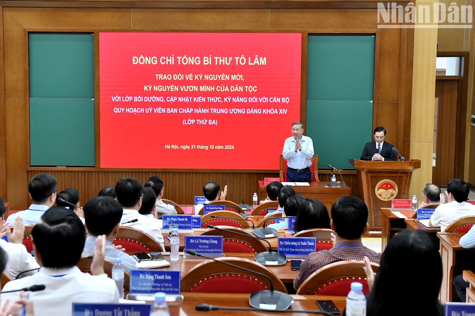 Trao đổi với lớp bồi dưỡng, cập nhật kiến thức, kỹ năng đối với cán bộ quy hoạch Ủy viên Trung ương Đảng khóa XIV (lớp thứ ba) ngày 31/10/2024 tại Hà Nội, Tổng Bí thư Tô Lâm nhấn mạnh: “Đó là kỷ nguyên phát triển, kỷ nguyên giàu mạnh dưới sự lãnh đạo, cầm quyền của Đảng, xây dựng thành công nước Việt Nam xã hội chủ nghĩa. Đích đến của kỷ nguyên vươn mình là dân giàu, nước mạnh, xã hội xã hội chủ nghĩa, sánh vai với các cường quốc năm châu. Ưu tiên hàng đầu trong kỷ nguyên mới là thực hiện thắng lợi các mục tiêu chiến lược đến năm 2030, Việt Nam trở thành nước đang phát triển có thu nhập trung bình cao; đến năm 2045 trở thành nước xã hội xã hội chủ nghĩa phát triển, có thu nhập cao; khơi dậy mạnh mẽ hào khí dân tộc, tinh thần tự chủ, tự tin, tự lực, tự cường, tự hào dân tộc, khát vọng phát triển đất nước; kết hợp chặt chẽ sức mạnh dân tộc với sức mạnh thời đại”1.