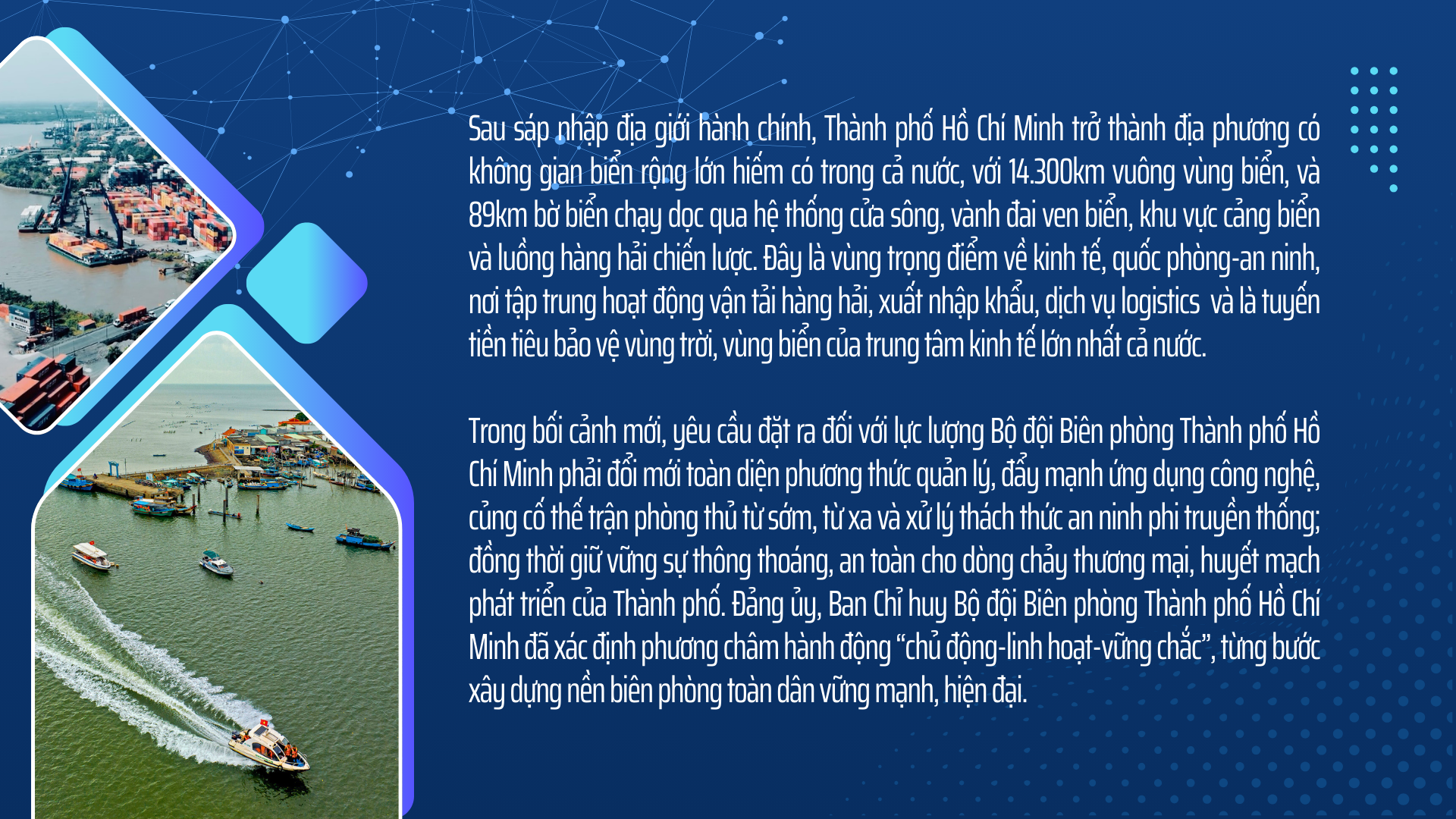 Vùng biển Thành phố Hồ Chí Minh là khu vực chiến lược, nơi giao thoa giữa phát triển kinh tế và nhiệm vụ bảo vệ chủ quyền quốc gia. Sự tăng trưởng mạnh của kinh tế biển, hoạt động xuất nhập khẩu, hệ thống cảng biển quốc tế càng làm nổi bật vai trò then chốt của lực lượng bộ đội biên phòng trong bảo vệ an ninh-an toàn hàng hải.
