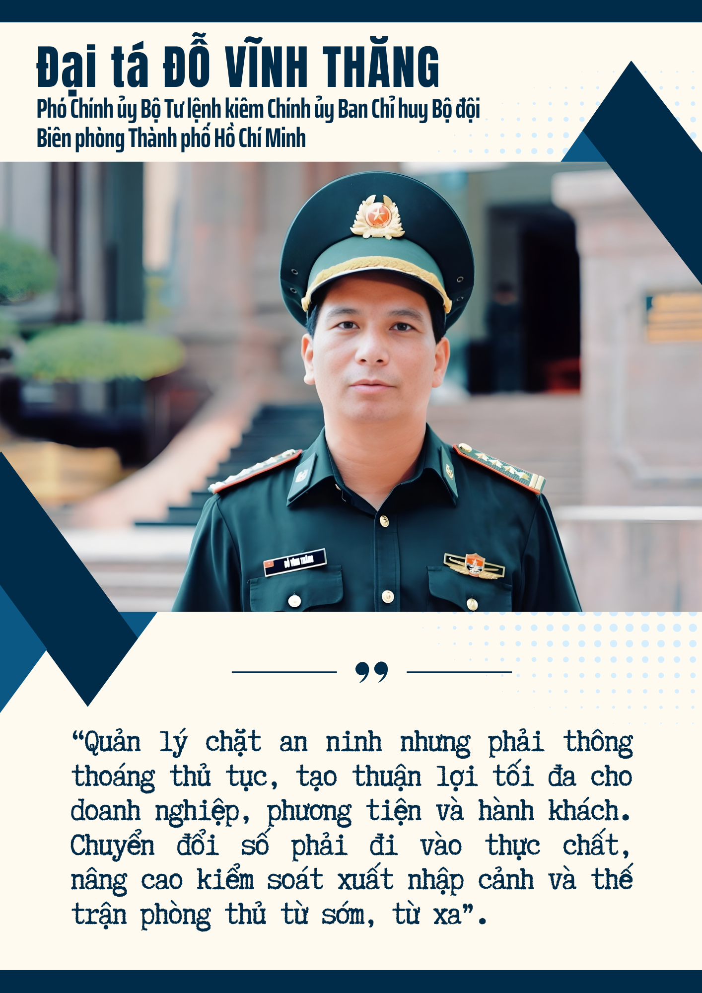 Năm 2025, ghi dấu bước chuyển mạnh mẽ của Biên phòng Cửa khẩu cảng Thành phố Hồ Chí Minh khi đồng bộ triển khai nền tảng cửa khẩu số, thủ tục biên phòng điện tử và mô hình cửa khẩu thông minh. Việc quản lý xuất nhập cảnh, giám sát phương tiện-thuyền viên-hàng hóa được số hóa, rút ngắn quy trình, minh bạch hóa thông tin, giảm tối đa thời gian chờ và nâng cao chất lượng dịch vụ cho cộng đồng doanh nghiệp.