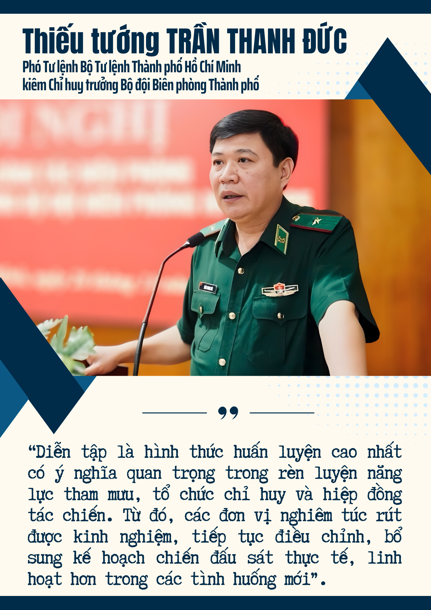 "Bộ đội Biên phòng phải tiếp tục phát huy vai trò nòng cốt trong bảo vệ chủ quyền, ứng dụng mạnh mẽ chuyển đổi số, đổi mới phương pháp, nâng cao chất lượng huấn luyện và xây dựng đơn vị chính quy, mẫu mực".