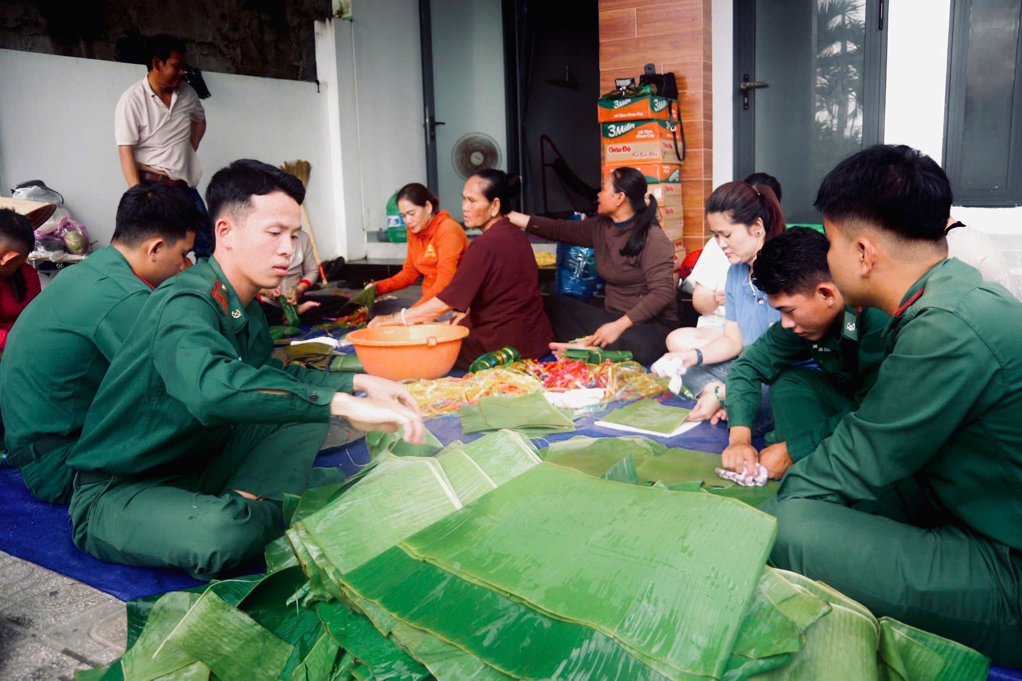 Chiến sĩ Biên phòng cùng người dân gói bánh tét gửi về miền trung.