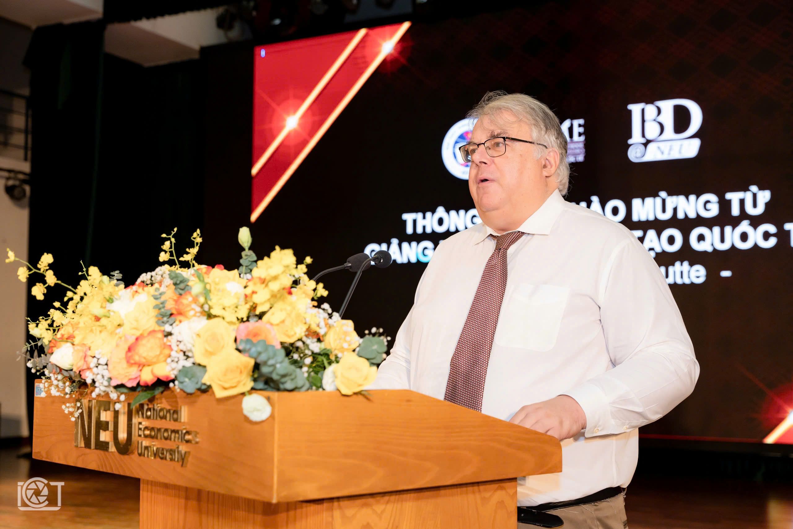 Ông Daniel Van Houtte phát biểu tại một sự kiện của Trường Đại học Kinh tế Quốc dân.