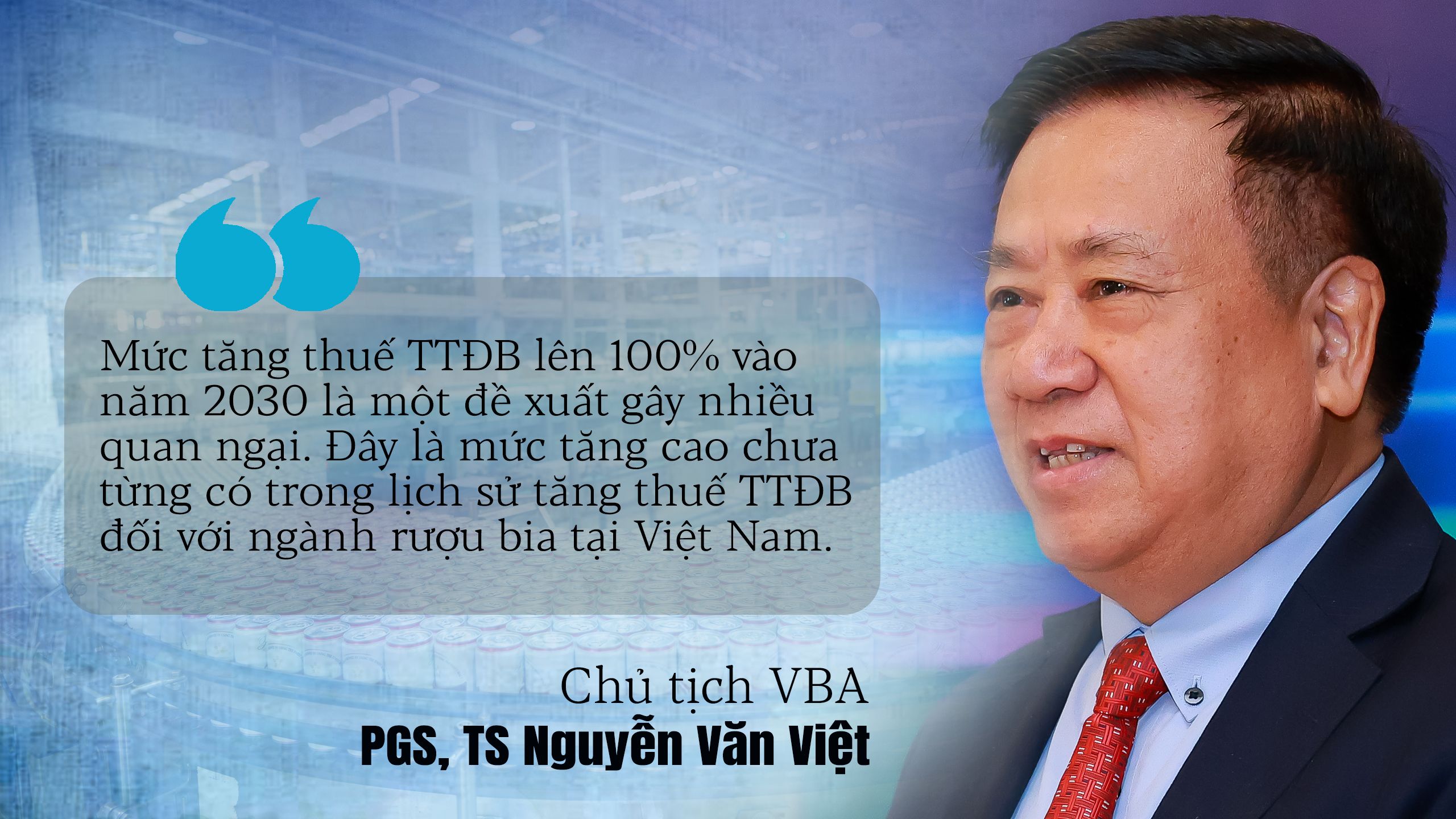 PGS, TS Nguyễn Văn Việt: Trước hết, tôi xin khẳng định, VBA luôn ủng hộ các chính sách của Đảng và Nhà nước nhằm bảo vệ sức khỏe cộng đồng và tăng thu ngân sách. Tuy nhiên, mức tăng thuế TTĐB đối với sản phẩm rượu bia lên 100% vào năm 2030 là một đề xuất gây nhiều quan ngại cho toàn ngành. Đây là mức tăng chưa từng có trong lịch sử tăng thuế TTĐB đối với ngành đồ uống, cụ thể với mặt hàng rượu bia tại Việt Nam.