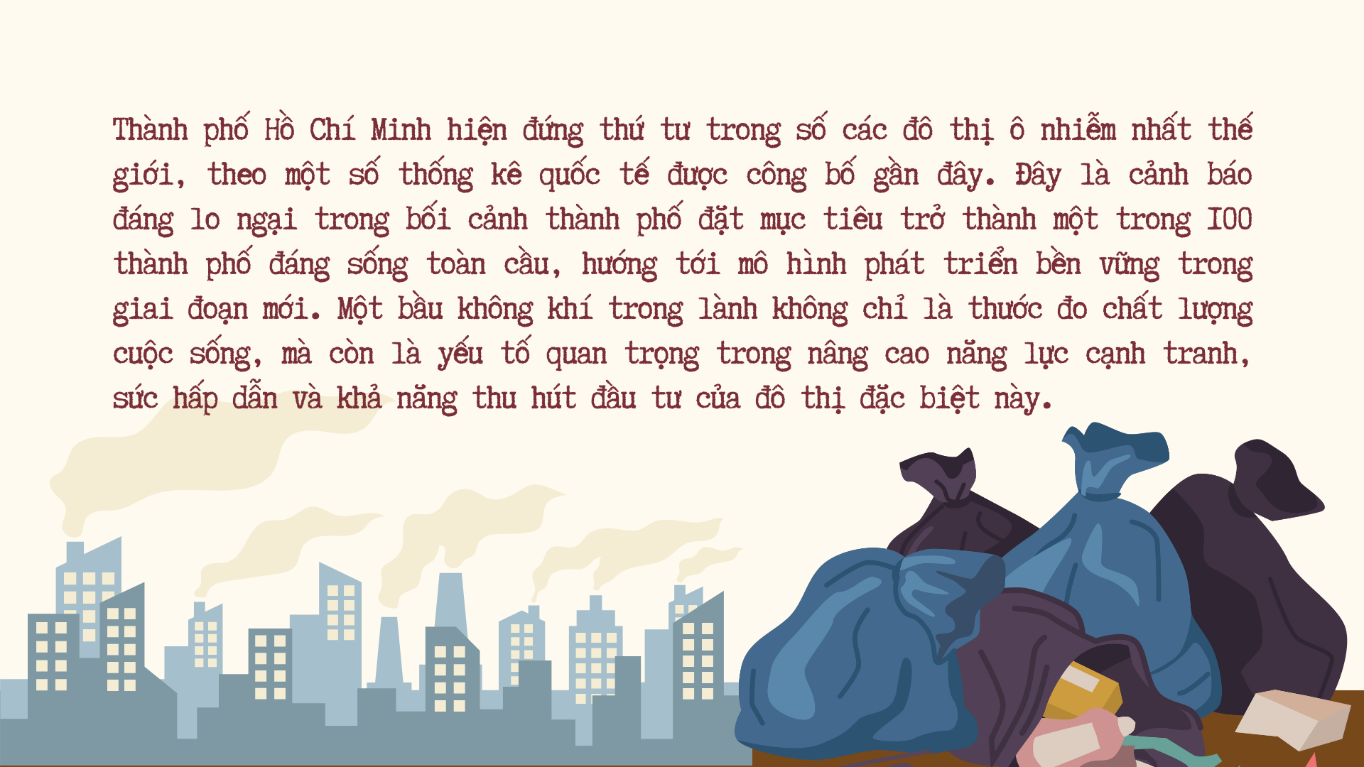 Là địa phương có tốc độ đô thị hóa nhanh nhất cả nước, Thành phố Hồ Chí Minh bên cạnh những thành tựu về kinh tế–xã hội cũng phải đối mặt với nhiều hệ lụy, trong đó ô nhiễm không khí.