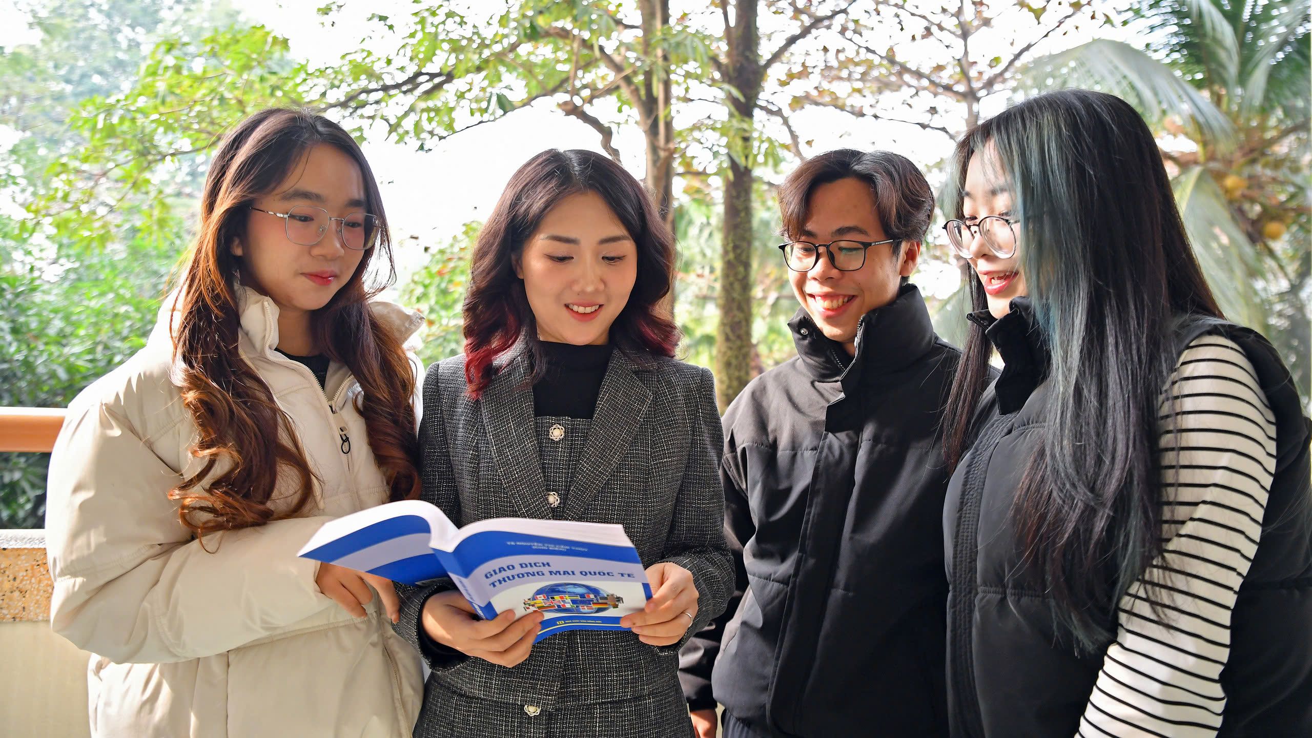 Phó Giáo sư, Tiến sĩ Trần Ngọc Mai (thứ 2 từ trái sang) thảo luận bài học với sinh viên Học viện Ngân hàng trong giờ nghỉ giải lao.