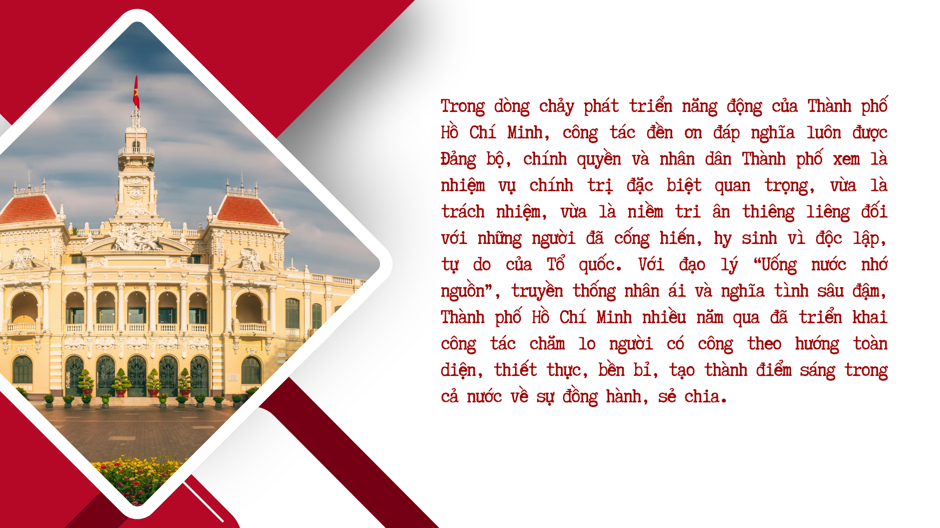 Trong nhịp phát triển mạnh mẽ, Thành phố Hồ Chí Minh tiếp tục kiên trì xây dựng các chương trình chăm lo thiết thực, sâu rộng; bảo đảm mọi người có công đều được tôn vinh và thụ hưởng đầy đủ chính sách; để mỗi mái ấm, mỗi khu phố, mỗi cộng đồng đều trở thành điểm tựa nghĩa tình. Đó cũng là cách Thành phố tri ân quá khứ, vun đắp hiện tại và kiến tạo tương lai, xây dựng một Thành phố Hồ Chí Minh ngày càng văn minh, hiện đại, giàu đẹp và nghĩa tình.