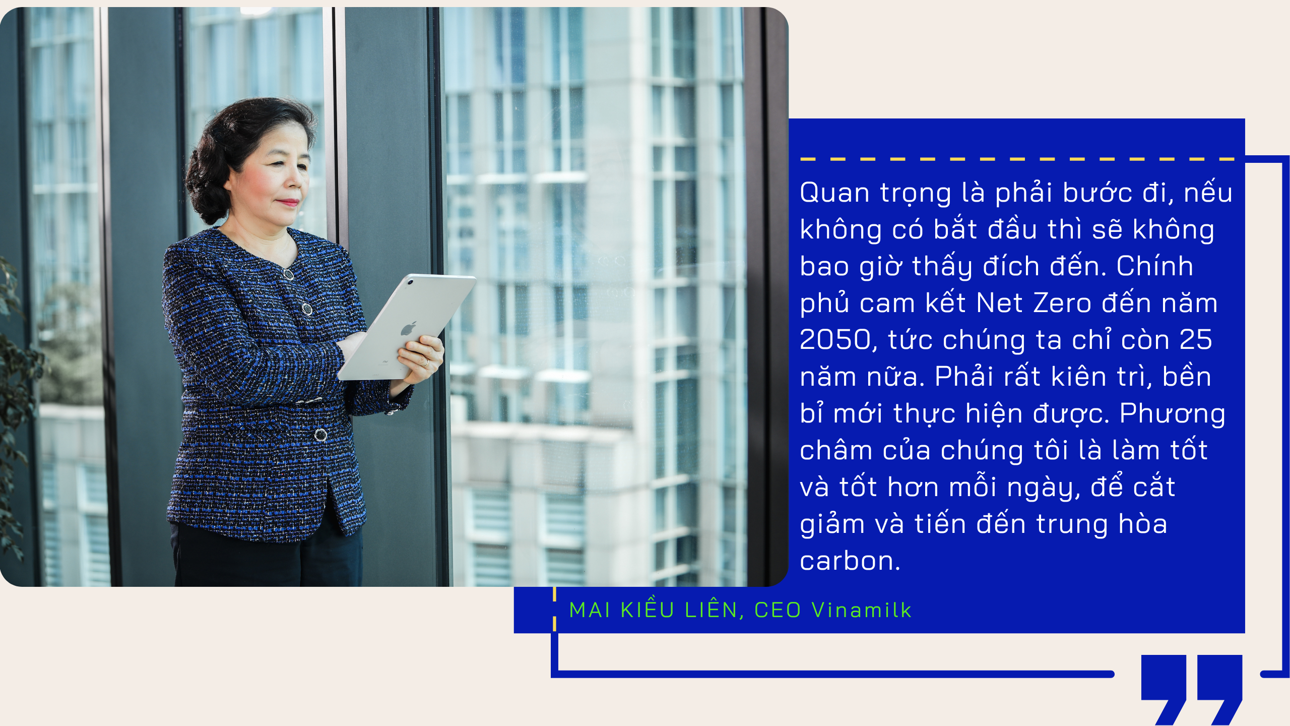 “Quan trọng là phải bước đi, nếu không có bắt đầu thì sẽ không bao giờ thấy đích đến. Chính phủ cam kết Net Zero đến năm 2050, tức chúng ta chỉ còn 25 năm nữa. Phải rất kiên trì, bền bỉ mới thực hiện được. Phương châm của chúng tôi là làm tốt và tốt hơn mỗi ngày, để cắt giảm và tiến đến trung hòa carbon”, bà Kiều Mai Liên, CEO Vinamilk chia sẻ đầy tâm huyết.