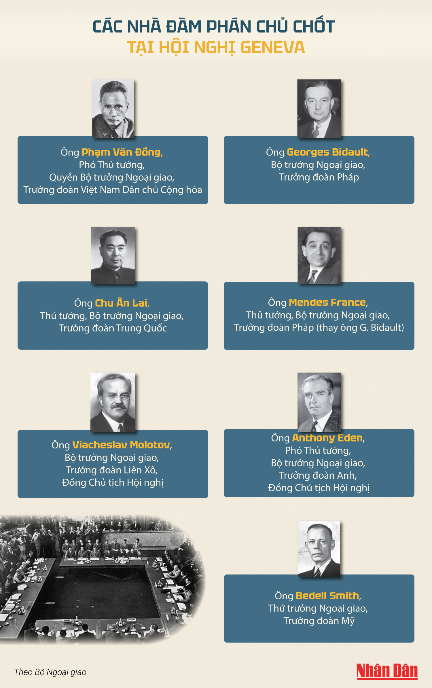 Hội nghị Geneva khai mạc ngày 8/5/1954 với sự tham gia của đại diện 9 bên gồm: Liên Xô, Trung Quốc, Việt Nam Dân chủ Cộng hòa, Mỹ, Anh, Pháp, Quốc gia Việt Nam, Vương quốc Lào, Vương quốc Campuchia. Đại diện Pathét Lào và Khmer Issarak có mặt tại Geneva nhưng không được tham dự Hội nghị.