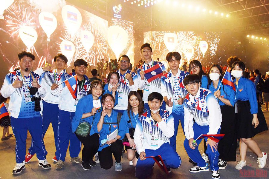Các vận động viên đoàn thể thao Lào chụp ảnh lưu niệm cùng các bạn tình nguyện viên Việt Nam tại lễ Bế mạc SEA Games 31 (Ảnh: TRẦN HẢI)