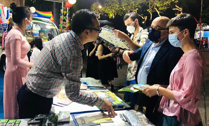 Quầy thông tin về du lịch Hà Nội thu hút sự quan tâm của khách nước ngoài (Ảnh: HPA)