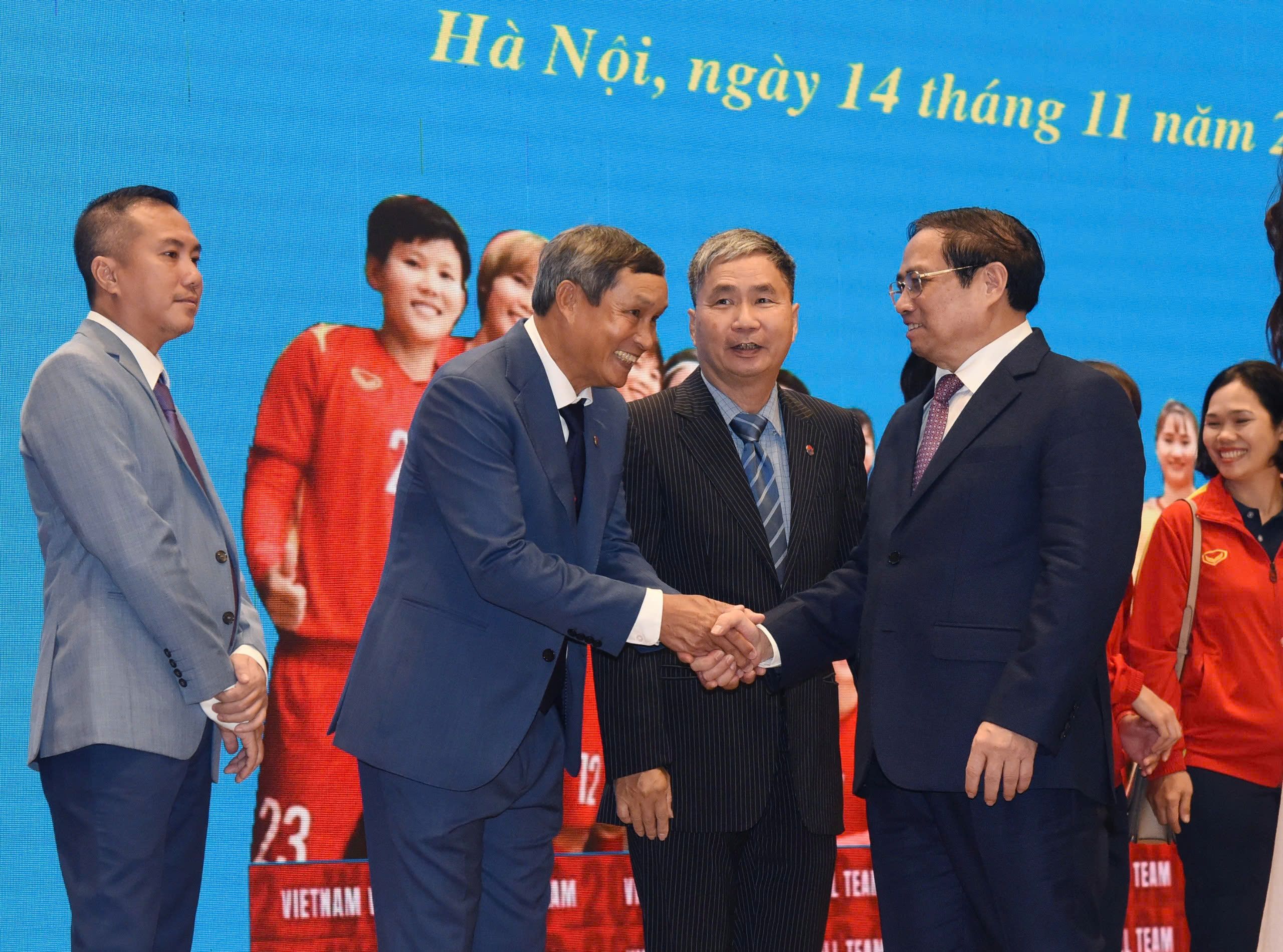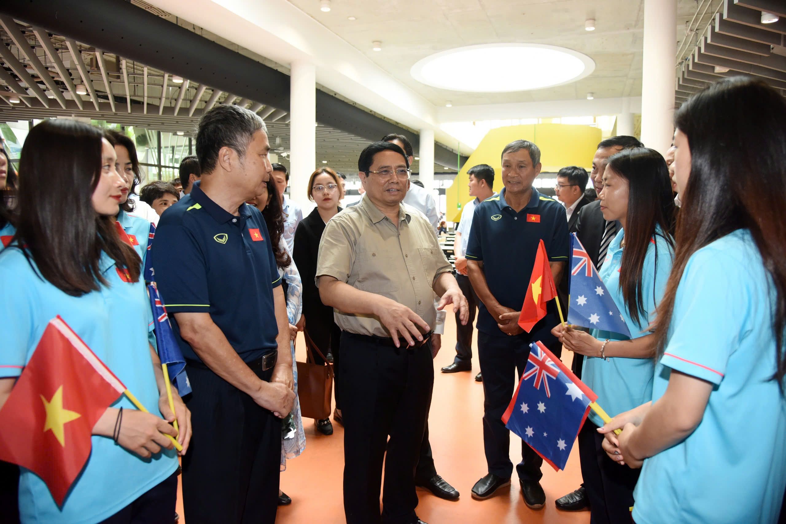 Thủ tướng Phạm Minh Chính ân cần hỏi thăm, động viên Ban huấn luyện, Đội tuyển bóng đá nữ Việt Nam.
