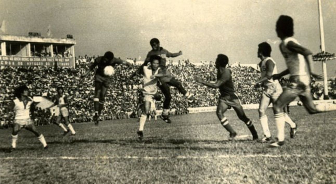 Pha đánh đầu ghi bàn mở tỷ số của cầu thủ Mai Đức Chung trong trận đấu giữa đội Tổng cục Đường sắt và Cảng Sài Gòn năm 1976. Ảnh tư liệu
