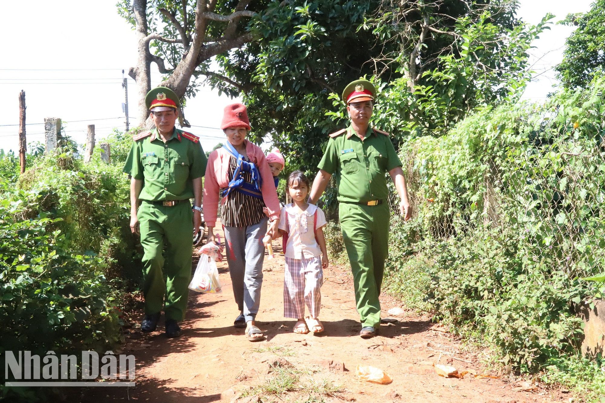 Cán bộ Công an xã Ea Sol hỗ trợ người dân địa phương đưa trẻ tới trường.