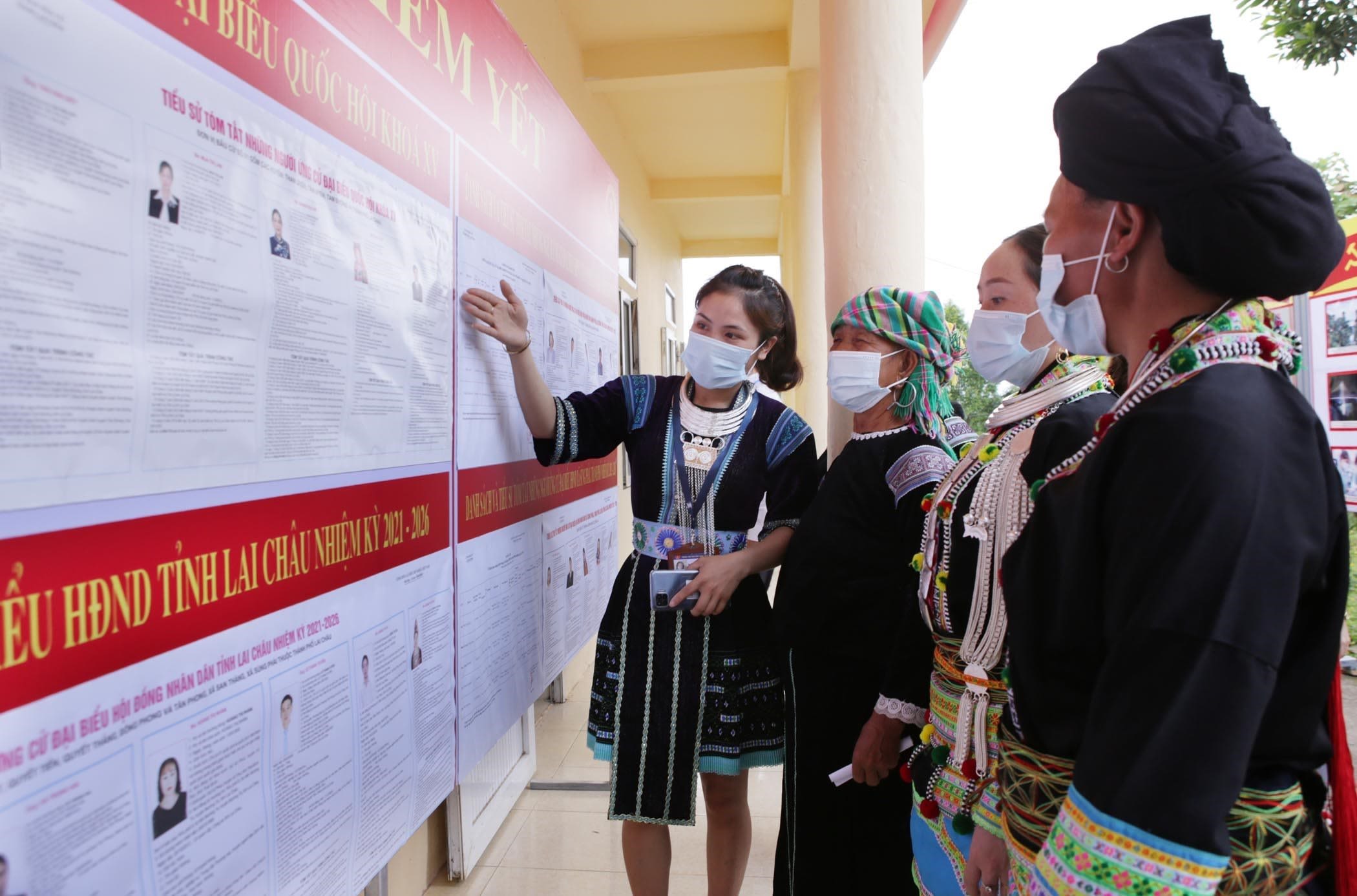 Cử tri Lai Châu xem thông tin cá nhân của đại biểu Quốc hội và đại biểu Hội đồng nhân dân các cấp khóa XV trước khi bỏ phiếu bầu.