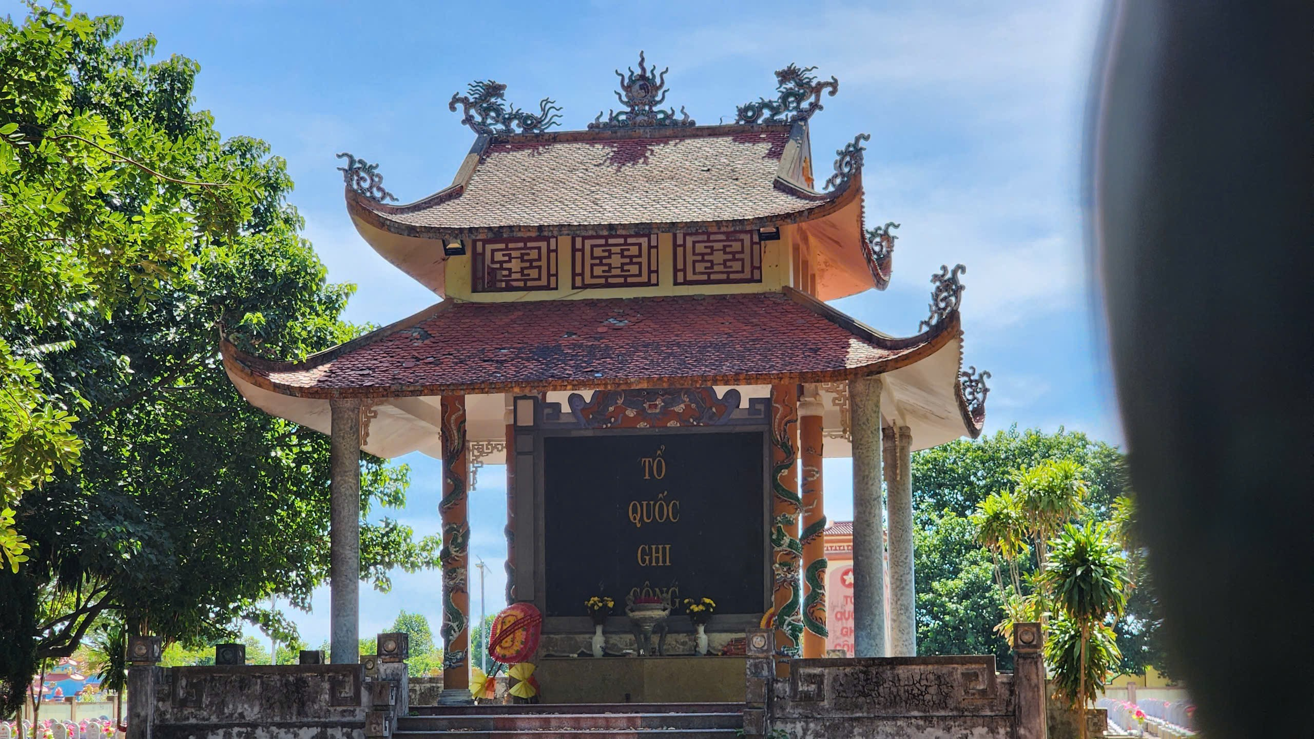 Trong khuôn viên rộng rãi được quy hoạch gọn gàng, nổi bật là tấm bia Tổ quốc ghi công cao 16,1m. Với chiều cao nổi bật ấy, trong quá khứ, tấm bia từng là “cột mốc” để địch bắn phá về bờ bắc. Trải qua nhiều lần trùng tu, một mặt sau của bia vẫn được giữ nguyên trạng, loang lổ vết đạn bom hằn in lên nền gạch cũ. Giữa các khe nứt, một thân cây bồ đề rắn rỏi đã bật chồi, vươn cao lên hứng nắng hôm nay.