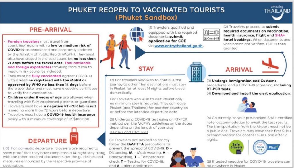 Cụ thể, trước khi đặt chân tới Phuket, du khách cần phải bảo đảm các yêu cầu sau: Khách du lịch nước ngoài phải đến từ những nước/ vùng lãnh thổ được Bộ Y tế Công cộng Thái Lan công nhận là có nguy cơ mắc Covid-19 trung bình hoặc thấp. Du khách phải có thời gian lưu trú tại các quốc gia kể trên trong ít nhất 21 ngày trước khi đến, phải hoàn thành việc tiêm vaccine Covid-19 ít nhất 14 ngày trước khi đến và phải có giấy chứng nhận tiêm vaccine. Du khách được yêu cầu phải có kết quả xét nghiệm RT-PCR âm tính trong khoảng 72 giờ trước khi đến và phải có bảo hiểm y tế Covid-19 ở mức thấp nhất là 100.000 USD.