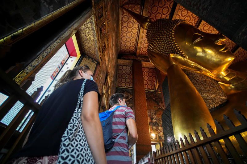 Du khách nước ngoài thăm tượng Phật nằm tại Bangkok hồi tháng 11/2021.