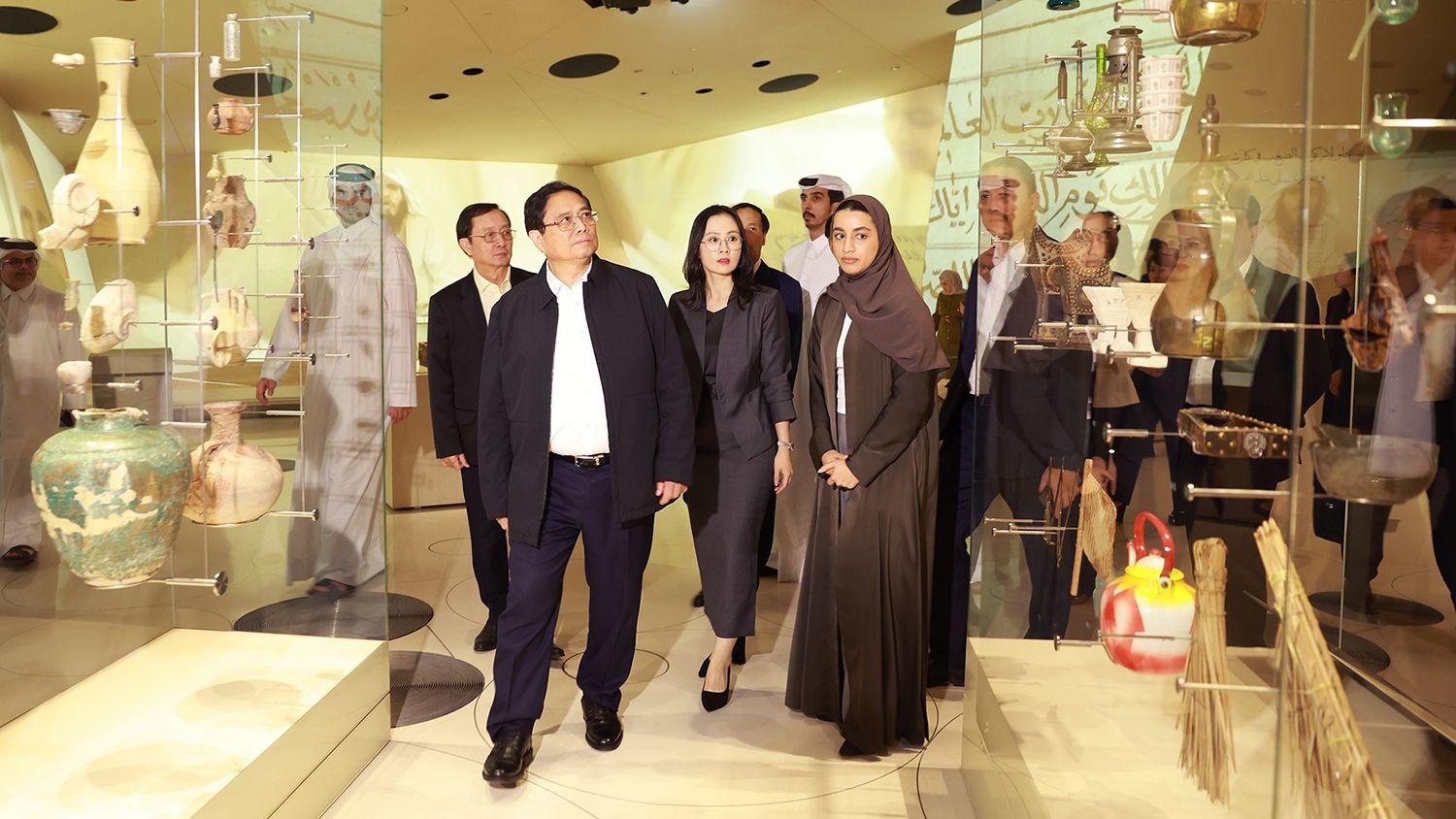 Thủ tướng Phạm Minh Chính tham quan các hiện vật trưng bày tại Bảo tàng Nghệ thuật Hồi giáo ở thủ đô Doha. (Ảnh: TTXVN)