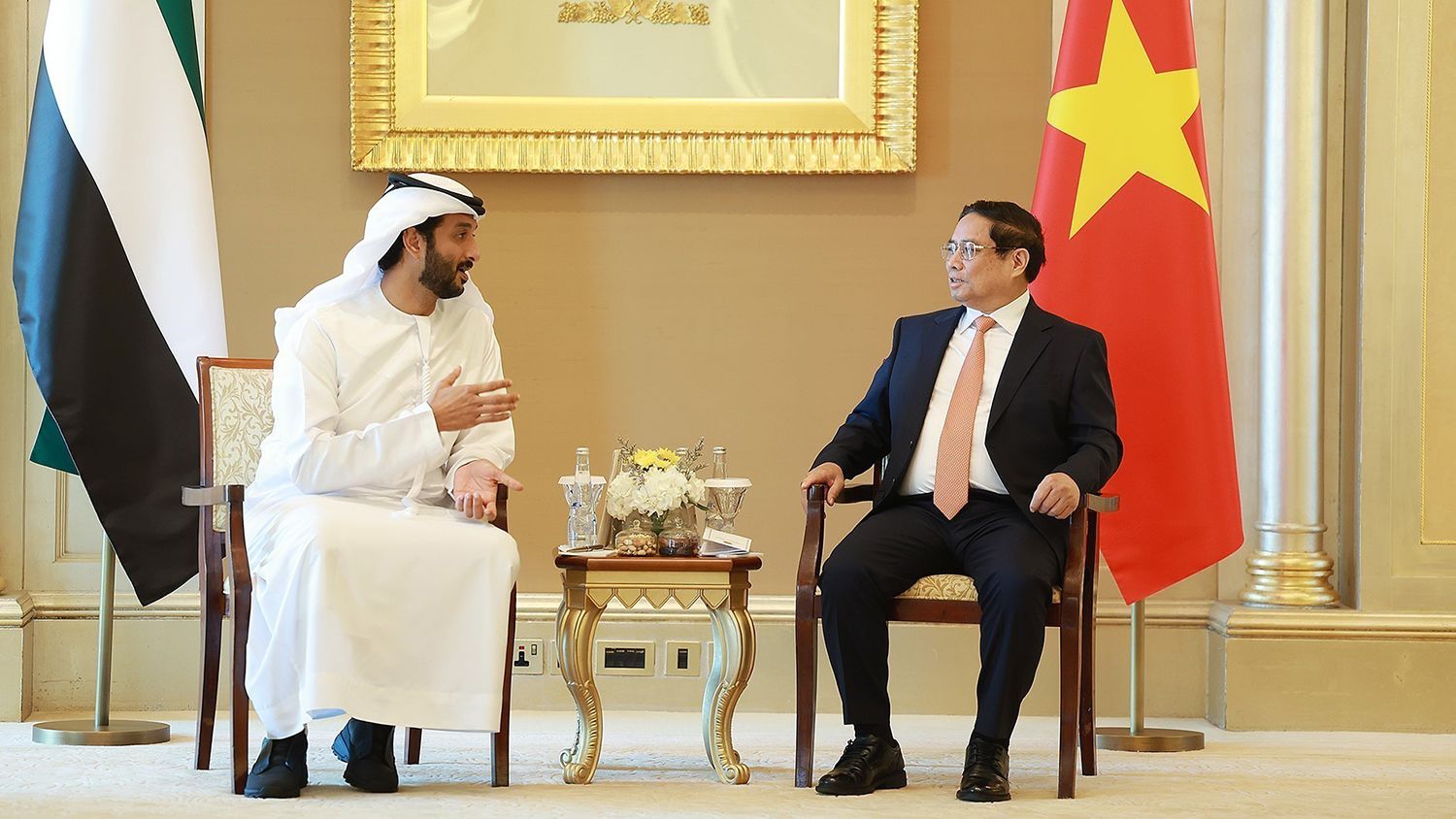 Thủ tướng Phạm Minh Chính và Tổng thống UAE Sheikh Mohamed bin Zayed Al Nahyan nhất trí 6 trọng tâm ưu tiên hợp tác, gồm khẩn trương xây dựng các chương trình hành động triển khai ngay khuôn khổ quan hệ Đối tác Toàn diện; thúc đẩy hợp tác về đổi mới sáng tạo, chuyển đổi xanh, chuyển đổi số, kinh tế tuần hoàn; tạo đột phá trong hợp tác kinh tế, thương mại, đầu tư song phương; hợp tác phát triển ngành Halal và mở cửa thị trường cho các sản phẩm Halal Việt Nam; tăng cường hợp tác lao động, văn hóa, du lịch, thể thao, giao lưu nhân dân và phối hợp chặt chẽ, tham vấn và ủng hộ lẫn nhau trong các vấn đề khu vực và thế giới tại các diễn đàn đa phương.