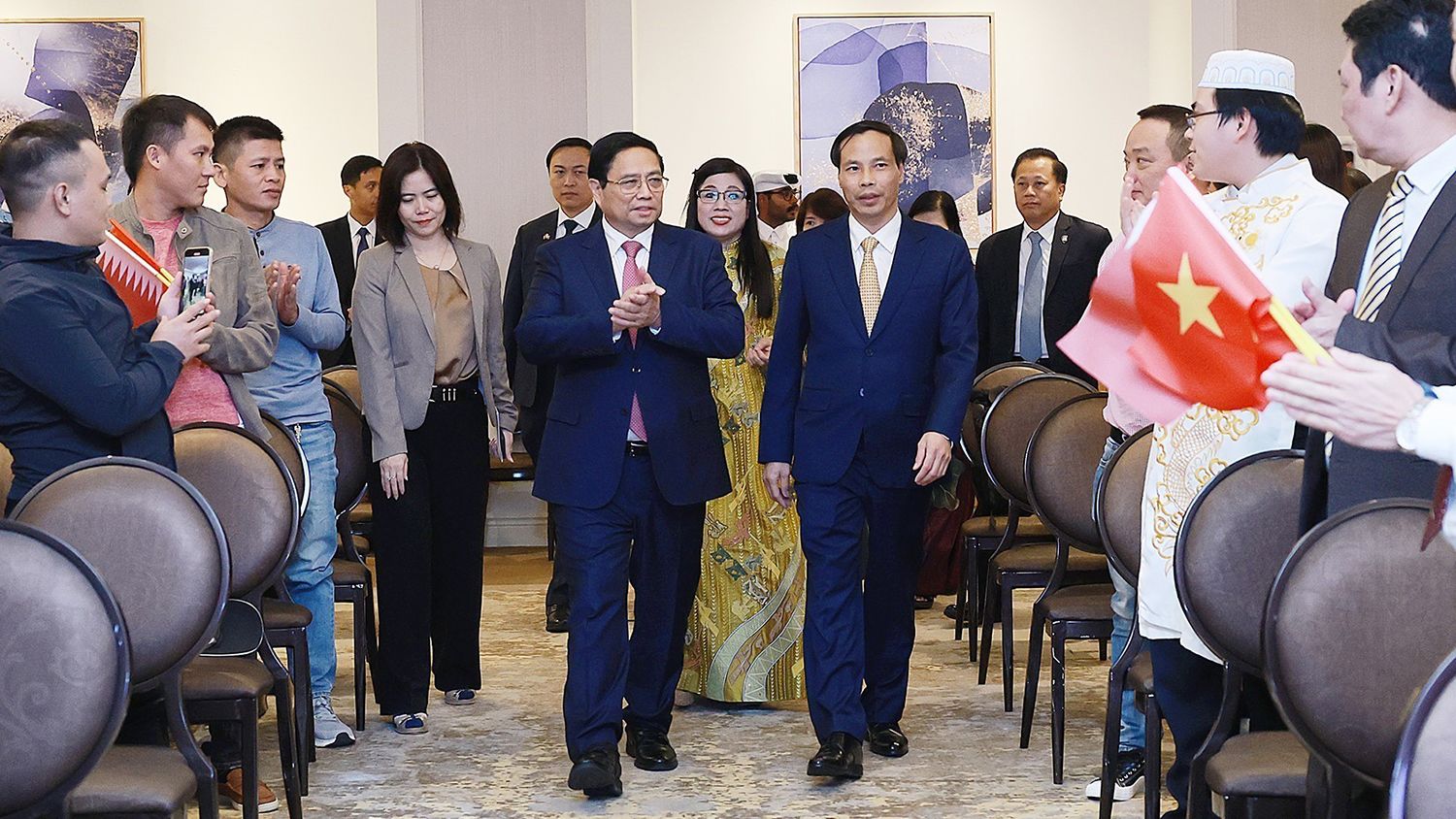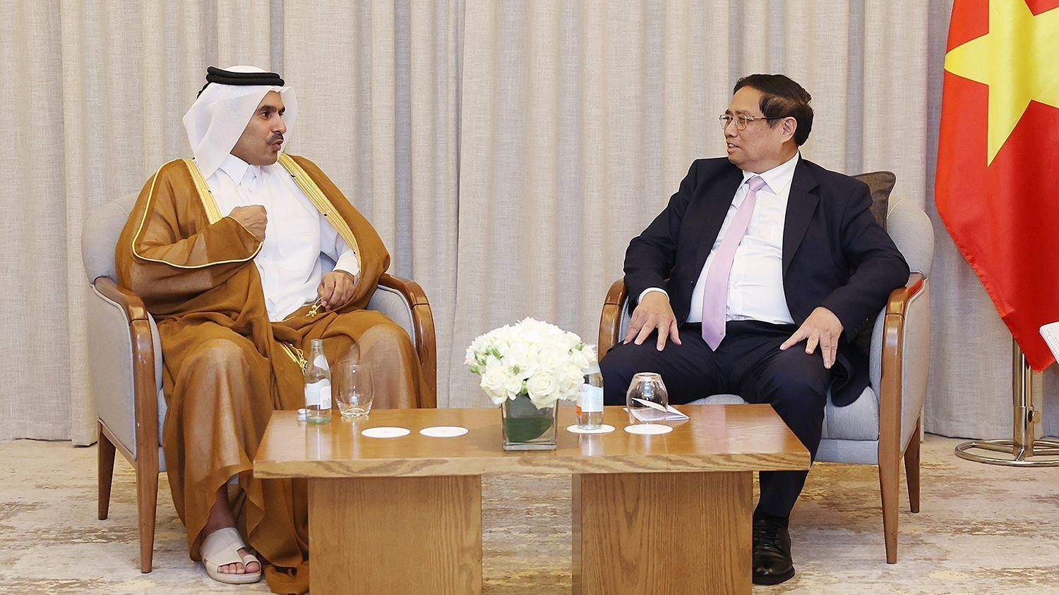 Tại thủ đô Doha, trong không khí chân thành, tin cậy và hiểu biết lẫn nhau, Thủ tướng Chính phủ Phạm Minh Chính đã hội kiến Quốc vương Qatar, Ngài Sheikh Tamim bin Hamad Al Thani; hội đàm Thủ tướng kiêm Bộ trưởng Ngoại giao Mohammed bin Abdulrahman bin Jassim Al Thani và hội kiến Chủ tịch Hội đồng Shura (Quốc hội) Hassan bin Abdulla Al-Ghanim.