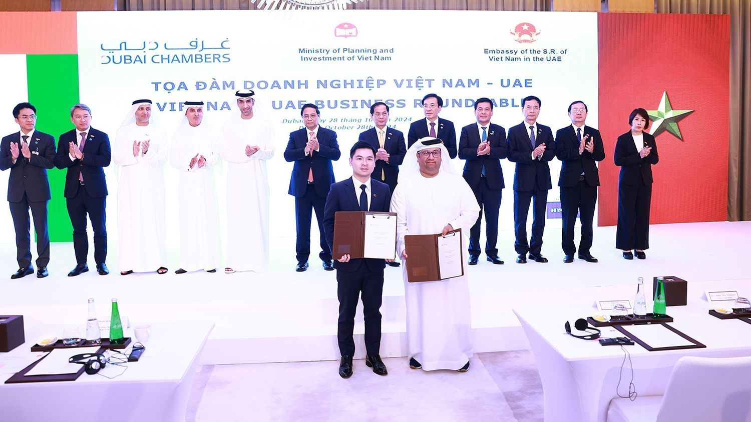 Tại thủ đô Abu Dhabi, các doanh nghiệp hai nước đã trao 12 văn kiện hợp tác trong các lĩnh vực AI, phát triển trung tâm dữ liệu, chuyển đổi năng lượng, hàng không, vận tải thủy nội địa, cảng biển, logistics, sản xuất ô tô điện, tài chính, nông nghiệp, dịch vụ.