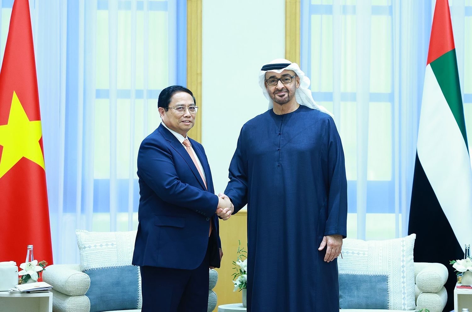 Thủ tướng Phạm Minh Chính hội đàm với Tổng thống UAE Sheikh Mohamed bin Zayed Al Nahyan. (Ảnh: TTXVN)