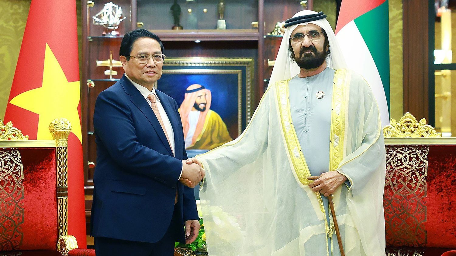 Thủ tướng Phạm Minh Chính và Phó Tổng thống, Thủ tướng UAE Sheikh Mohammed bin Rashid Al. (Ảnh: TTXVN)