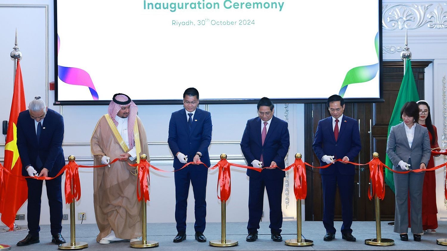 Thủ tướng Phạm Minh Chính cắt băng khai trương Văn phòng của FPT khu vực Trung Đông tại Riyadh. (Ảnh: TTXVN)