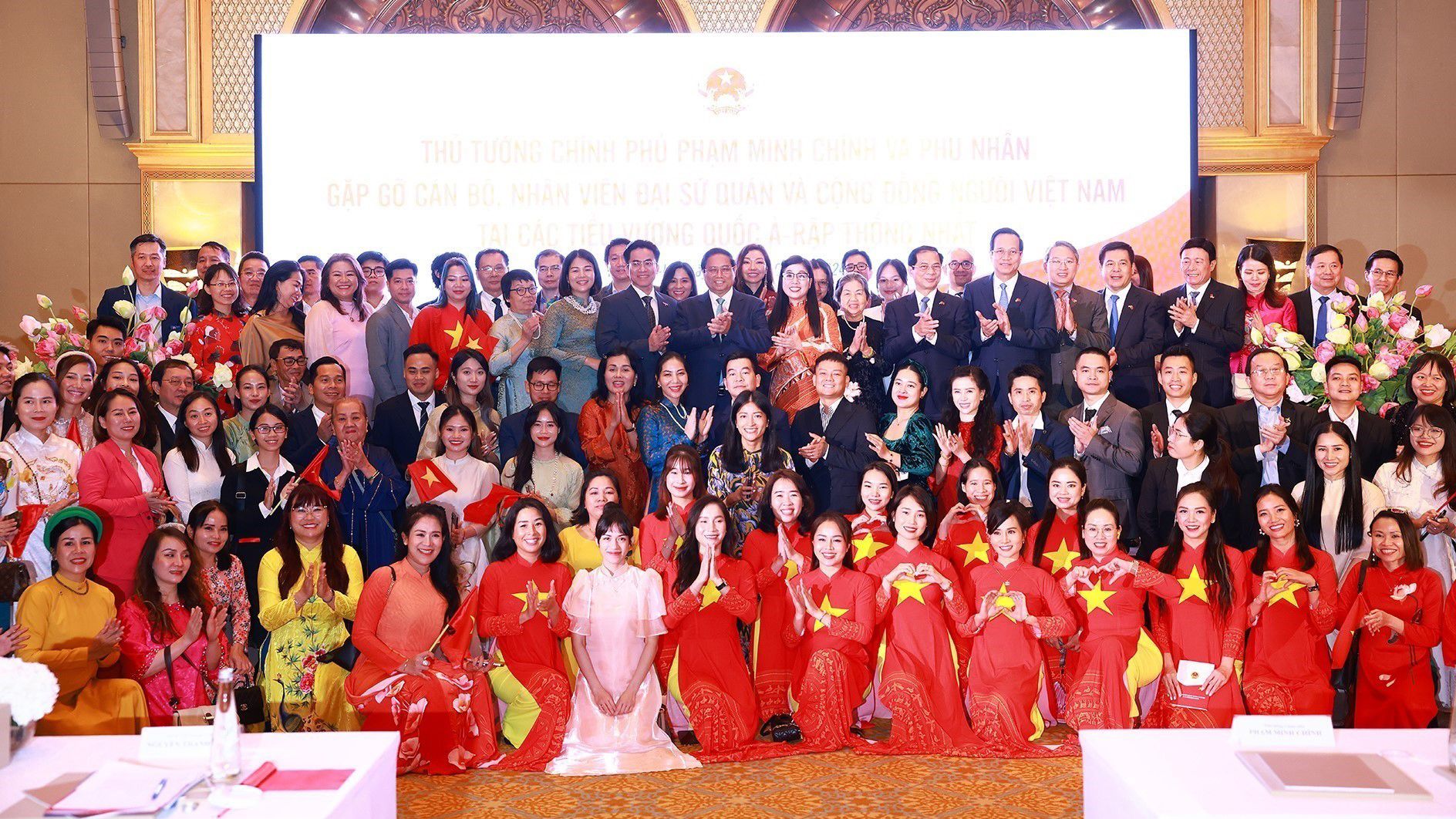 Thủ tướng Phạm Minh Chính và Phu nhân với cộng đồng người Việt Nam tại UAE. (Ảnh: TTXVN)