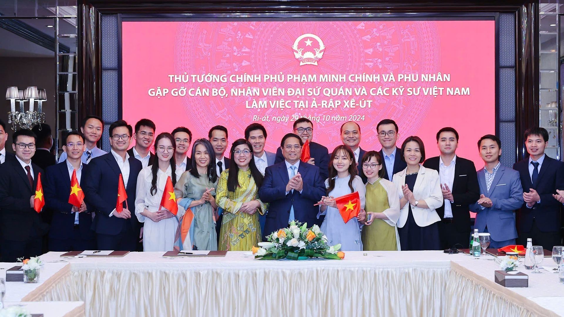 Thủ tướng Phạm Minh Chính và Phu nhân với cán bộ, nhân viên Đại sứ quán Việt Nam và các kỹ sư đang làm việc tại Saudi Arabia. (Ảnh: TTXVN)