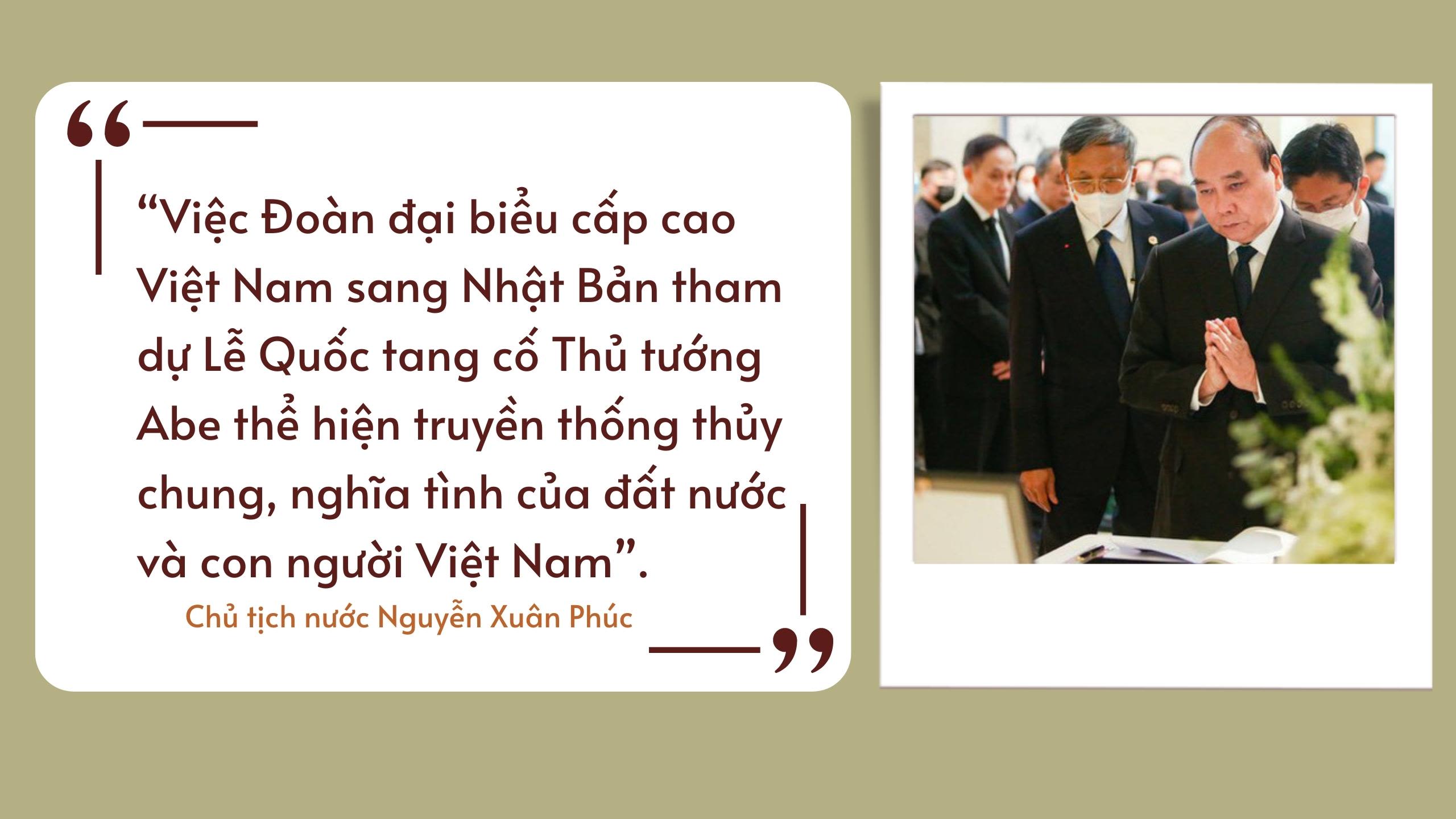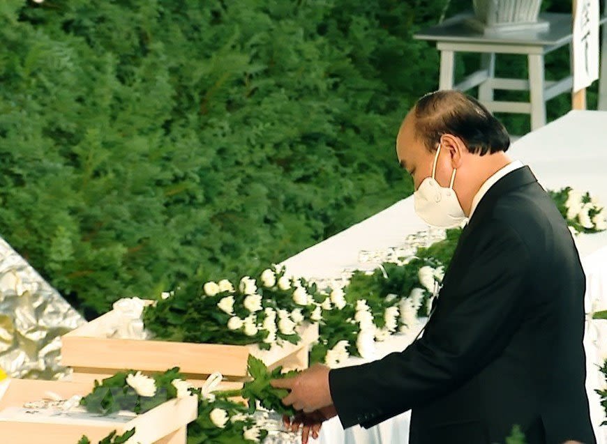 Dự Lễ Quốc tang, Chủ tịch nước Nguyễn Xuân Phúc và Đoàn đại biểu cấp cao Việt Nam đã đặt hoa viếng, tướng nhớ cố Thủ tướng Abe, người bạn thân thiết của Việt Nam; bày tỏ trân trọng tình cảm đặc biệt và sự ủng hộ, hỗ trợ quý báu mà cố Thủ tướng Abe Shinzo dành cho đất nước và con người Việt Nam; bày tỏ chia buồn sâu sắc đến đảng Dân chủ Tự do, Chính phủ, Quốc hội, nhân dân Nhật Bản và gia quyến cố Thủ tướng Abe Shinzo.