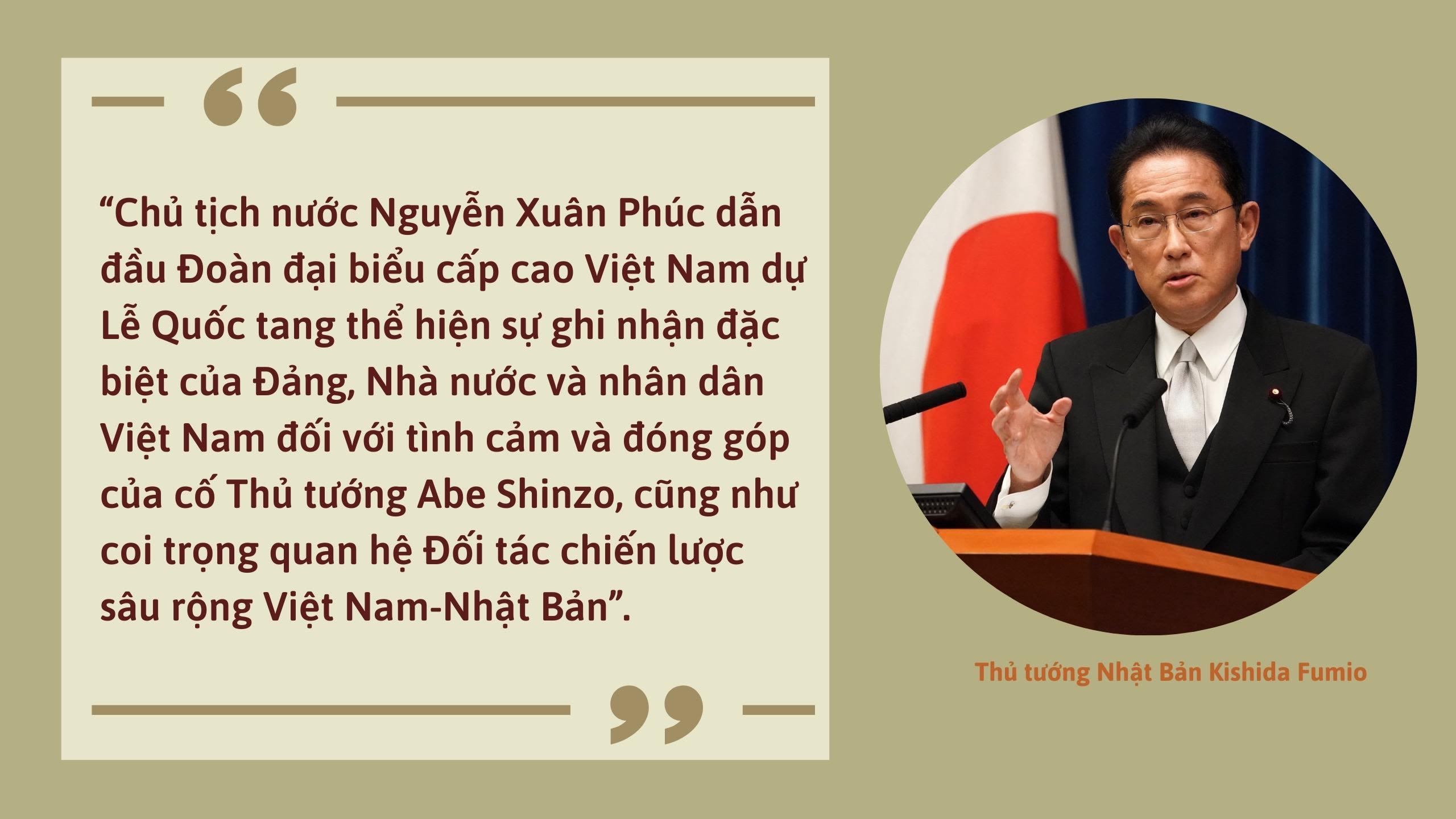 Thay mặt lãnh đạo Đảng, Nhà nước và nhân dân Việt Nam, Chủ tịch nước Nguyễn Xuân Phúc đã dự Lễ Quốc tang cố Thủ tướng Nhật Bản Abe Shinzo, thể hiện tình cảm và sự trân trọng của lãnh đạo và nhân dân Việt Nam đối với những đóng góp của cố Thủ tướng Abe Shinzo trong việc thúc đẩy quan hệ hai nước. Việc Đoàn đại biểu cấp cao Việt Nam dự Lễ Quốc tang cố Thủ tướng Abe Shinzo cũng khẳng định Việt Nam coi trọng và mong muốn làm sâu sắc quan hệ Đối tác chiến lược sâu rộng vì hòa bình và thịnh vượng ở châu Á giữa Việt Nam và Nhật Bản.