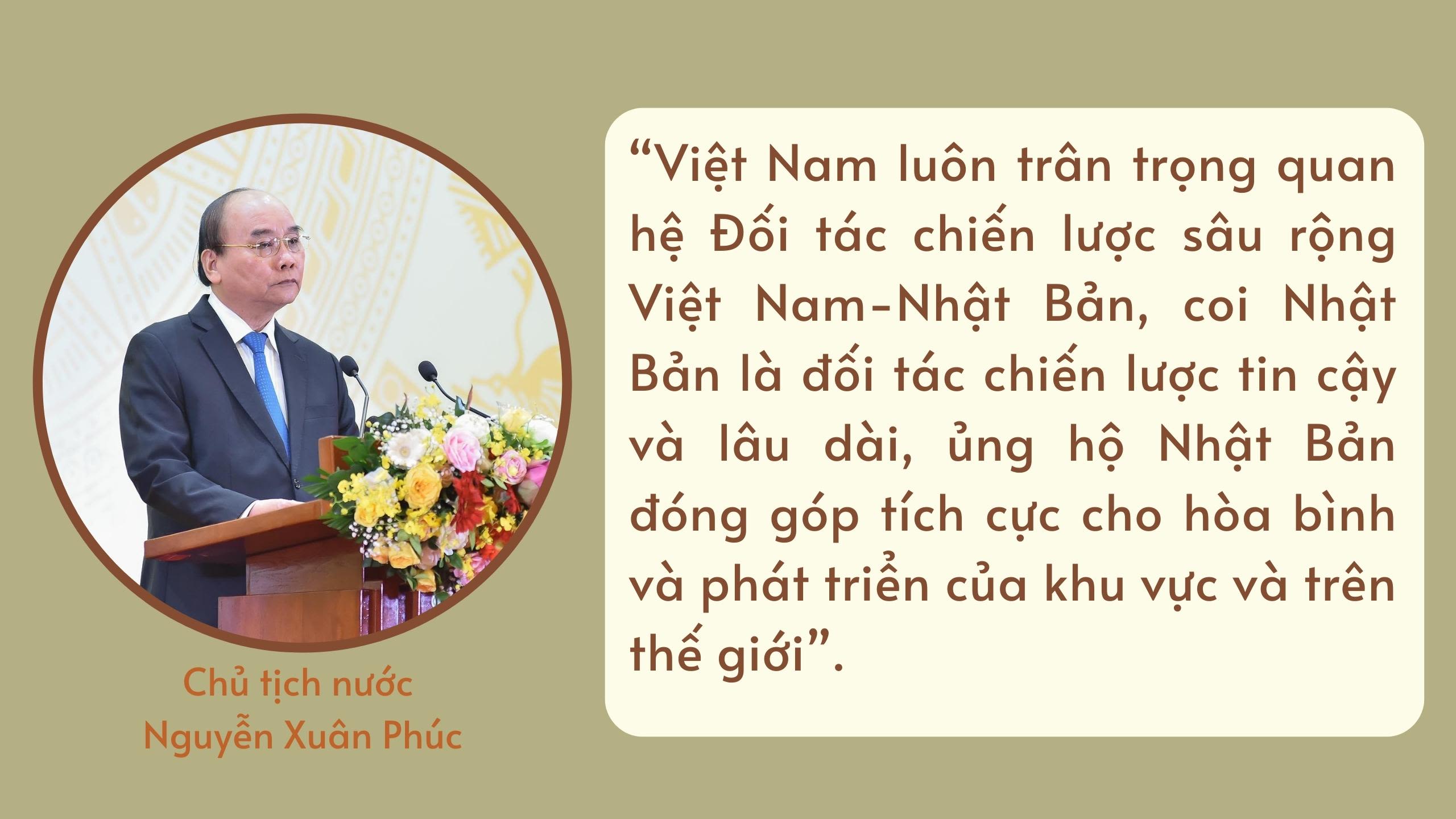 Quan hệ Đối tác chiến lược sâu rộng Việt Nam–Nhật Bản đang phát triển mạnh mẽ và toàn diện, với sự tin cậy chính trị cao. Nhật Bản tiếp tục là đối tác kinh tế quan trọng hàng đầu của Việt Nam. Hai bên tích cực chuẩn bị các hoạt động kỷ niệm 50 năm thiết lập quan hệ ngoại giao Việt Nam-Nhật Bản vào năm 2023; phối hợp chặt chẽ, hiệu quả tại các diễn đàn đa phương trên các vấn đề quốc tế và khu vực cùng quan tâm.