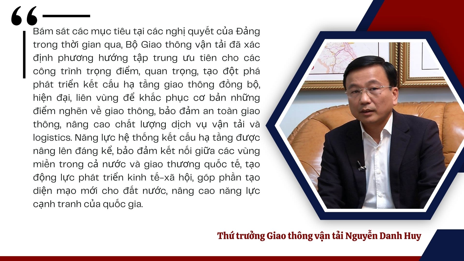Thứ trưởng Giao thông vận tải Nguyễn Danh Huy khẳng định: “Bám sát các mục tiêu tại các nghị quyết của Đảng trong thời gian qua, Bộ Giao thông vận tải đã xác định phương hướng tập trung ưu tiên cho các công trình trọng điểm, quan trọng, tạo đột phá phát triển kết cấu hạ tầng giao thông đồng bộ, hiện đại, liên vùng để khắc phục cơ bản những điểm nghẽn về giao thông, bảo đảm an toàn giao thông, nâng cao chất lượng dịch vụ vận tải và logistics. Năng lực hệ thống kết cấu hạ tầng được nâng lên đáng kể, bảo đảm kết nối giữa các vùng miền trong cả nước và giao thương quốc tế, tạo động lực phát triển kinh tế-xã hội, góp phần tạo diện mạo mới cho đất nước, nâng cao năng lực cạnh tranh của quốc gia”.