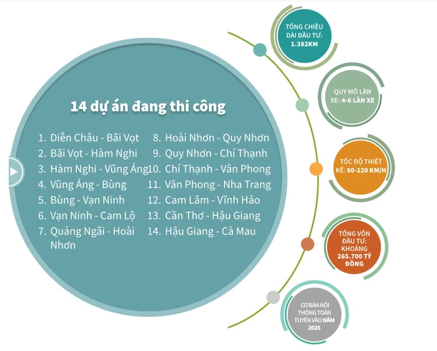 Để hiện thực hóa mục tiêu đến năm 2030, cả nước có 5.000km đường cao tốc, Bộ Giao thông vận tải và các địa phương đang tiếp tục triển khai đầu tư 35 dự án đường cao tốc với tổng chiều dài 2.074km; trong đó, có 10 dự án đang thi công như: Bến Lức-Long Thành, Vành đai 4 Vùng Thủ đô, Vành đai 3 Thành phố Hồ Chí Minh, Hữu Nghị-Chi Lăng,... Bên cạnh đó, 13 dự án cao tốc (dài gần 700km) cũng đã được phê duyệt chủ trương đầu tư, cân đối nguồn vốn như: Đồng Đăng-Trà Lĩnh, Bảo Lộc-Liên Khương, Thành phố Hồ Chí Minh-Mộc Bài,… cùng 9 dự án (dài 678km) đang lập chủ trương đầu tư như Thái Nguyên-Chợ Mới, Cổ Tiết-Chợ Bến, Vành đai 4 Thành phố Hồ Chí Minh...