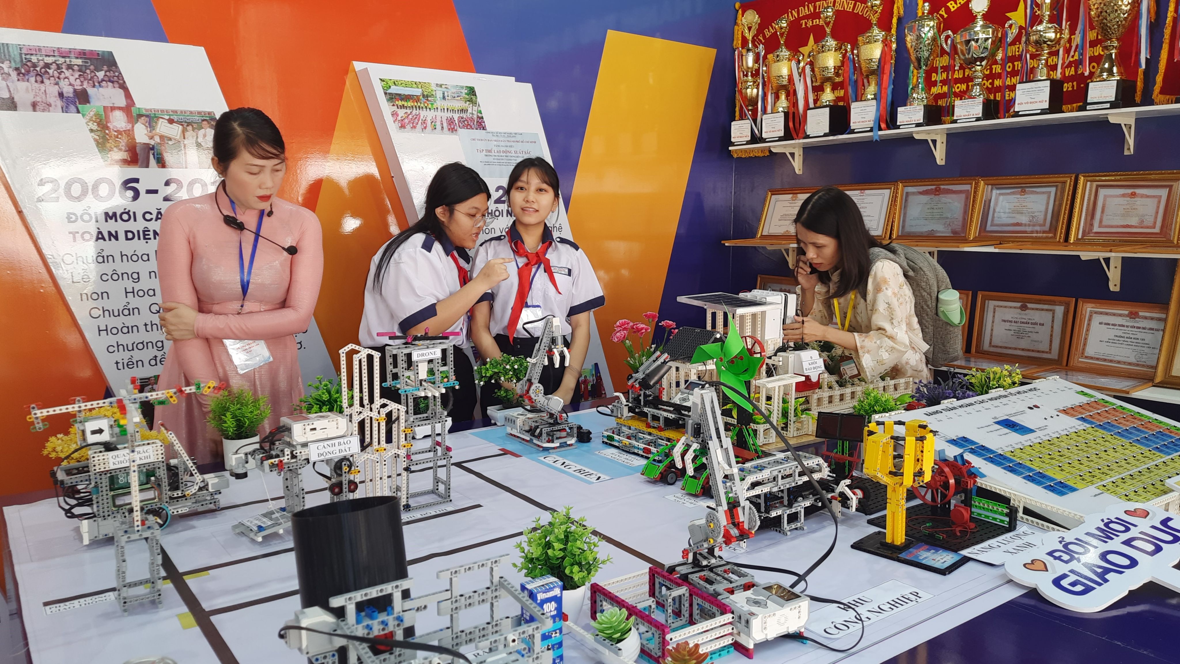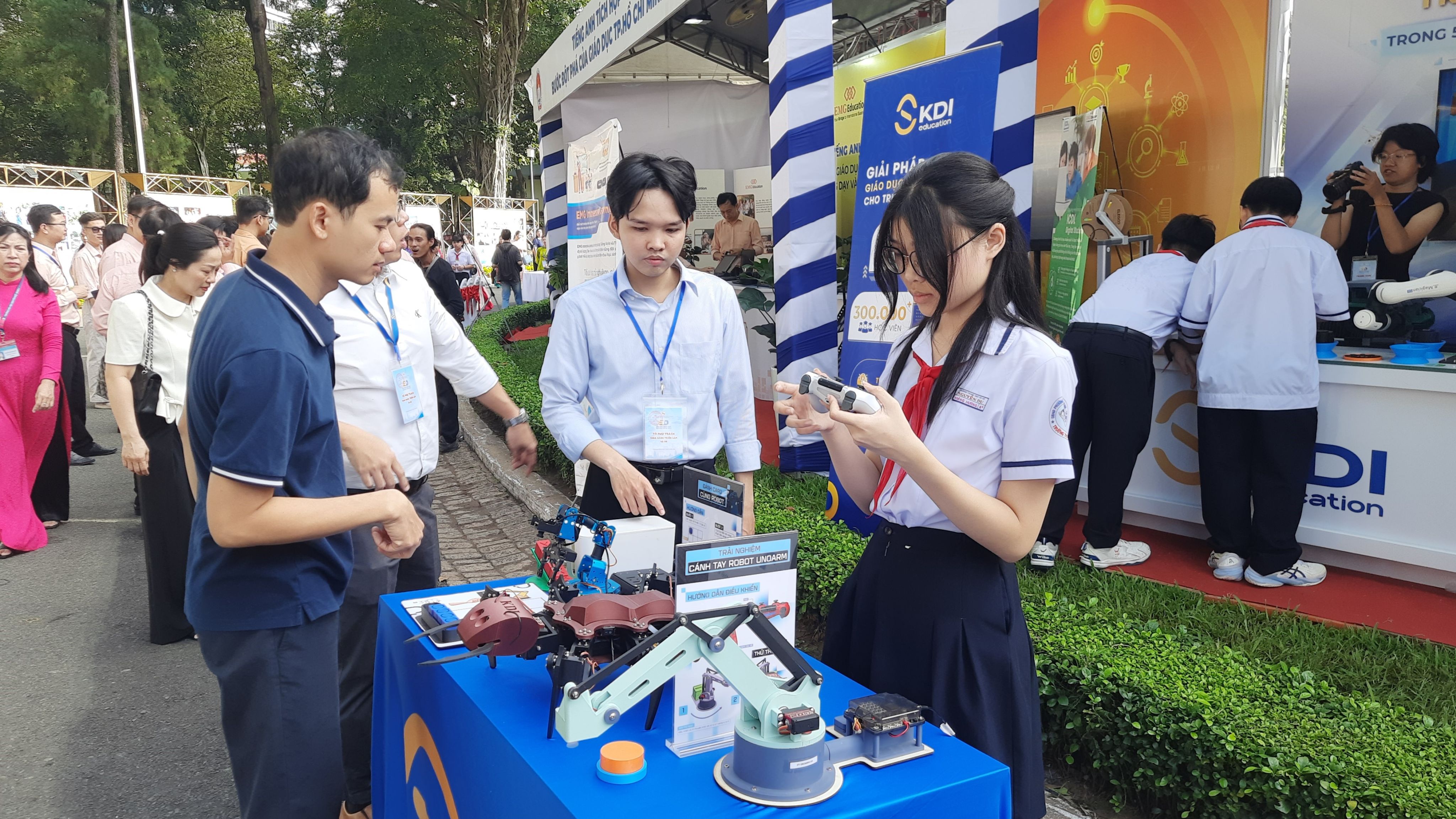 Học sinh trải nghiệm mô hình STEM tại Triễn lãm 50 năm đổi mới giáo dục Thành phố Hồ Chí Minh.