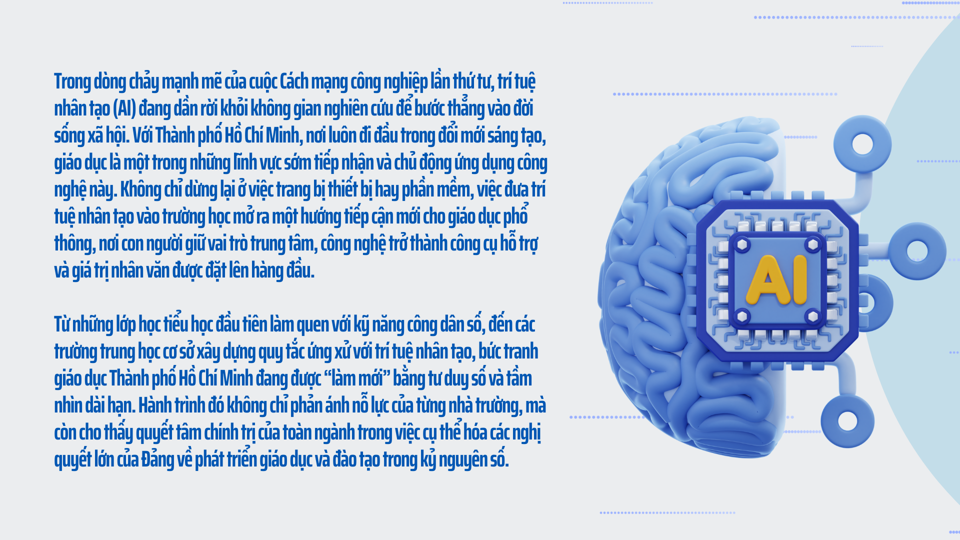 Là trung tâm kinh tế, văn hóa và khoa học công nghệ của cả nước, Thành phố Hồ Chí Minh sớm xác định giáo dục phải đi trước một bước trong tiến trình chuyển đổi số. Trí tuệ nhân tạo vì thế không còn là khái niệm xa lạ, mà đang dần trở thành một phần của hoạt động dạy và học tại nhiều cơ sở giáo dục.