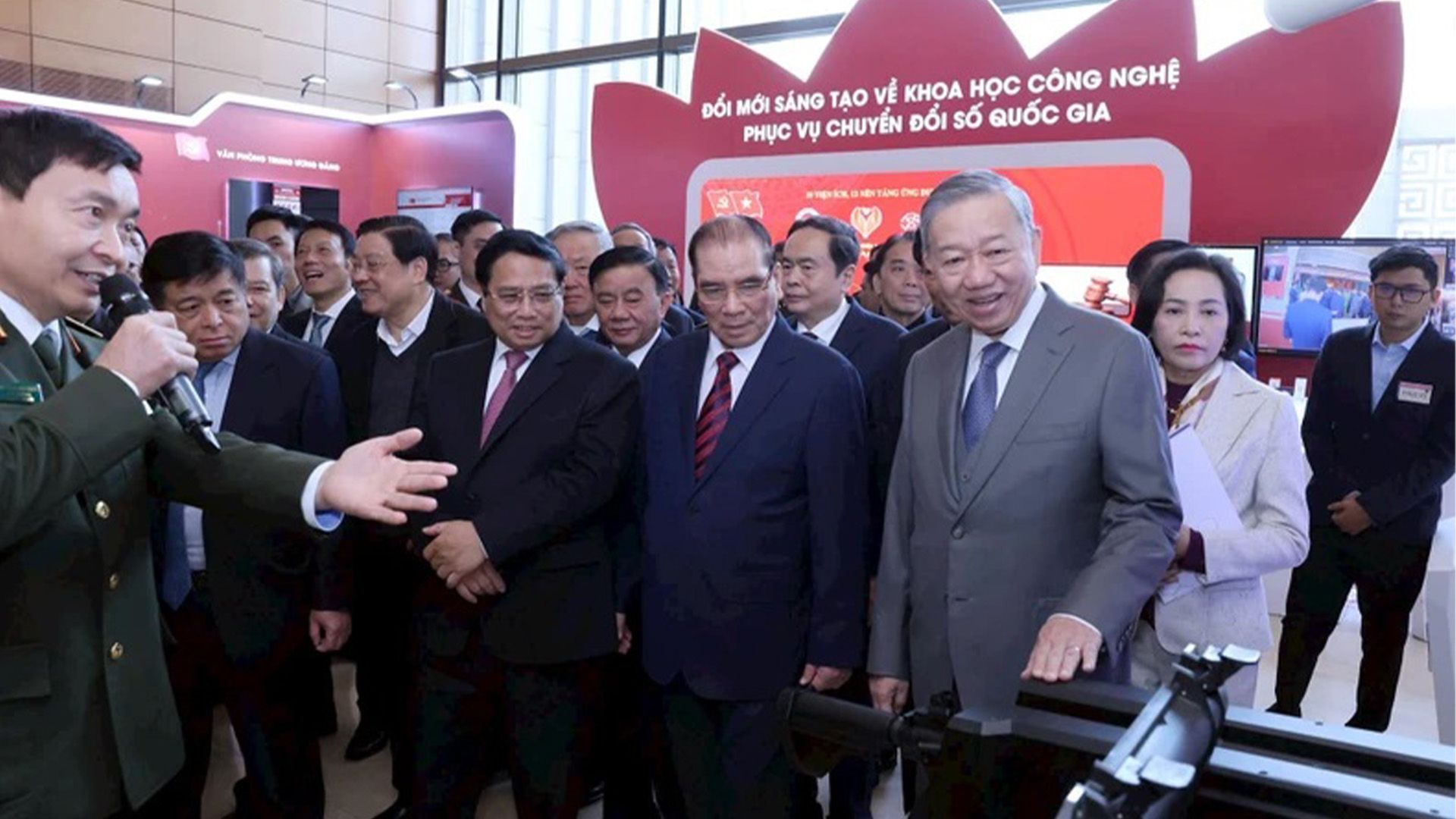 Tổng Bí thư Tô Lâm cùng các đồng chí lãnh đạo Đảng, Nhà nước tham quan trưng bày khoa học, công nghệ tại Nhà Quốc hội.