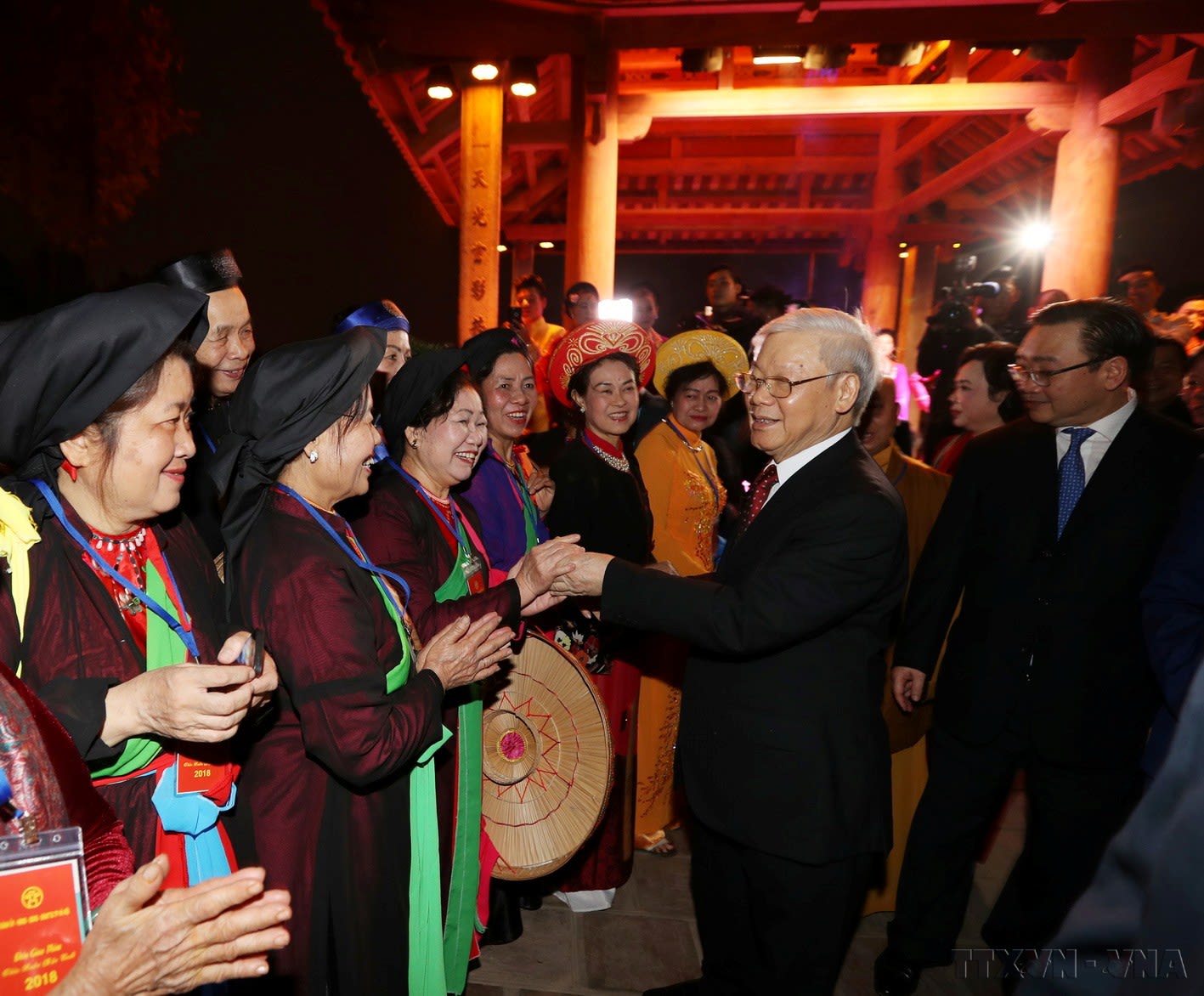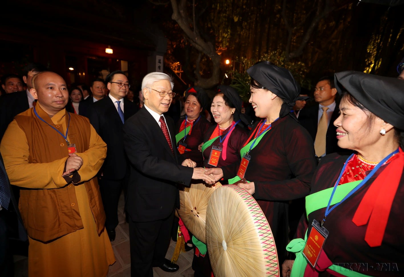 Tổng Bí thư Ban Chấp hành Trung ương Đảng Cộng sản Việt Nam Nguyễn Phú Trọng thăm hỏi, chúc Tết nhân dân và các nghệ sỹ tại Đền Ngọc Sơn.