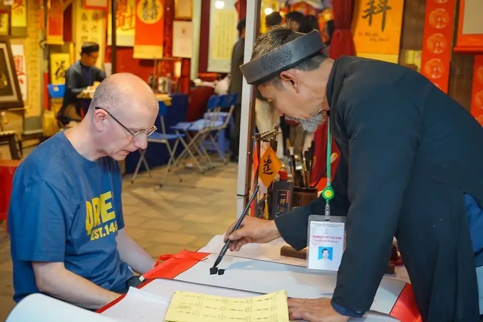 Một du khách nước ngoài chăm chú từng nét bút của ông đồ tại Hội chữ Xuân Quý Mão 2023. ẢNH: KHÁNH HÒA/TTXVN